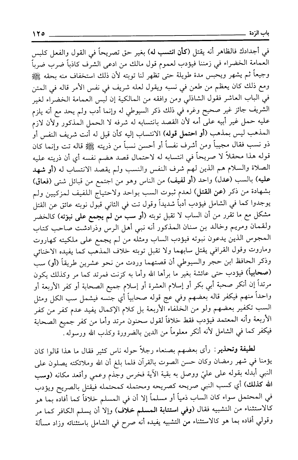 في أجدادك فالظاهر أنه يقتل (كأن انتسب له) بغير حق تصريحًا في القول والفعل كلبس العمامة الخضراء في زمننا فيؤدب لعموم قول مالك من ادعى الشرف كاذبًا ضرب ضربًا وجيعًا ثم يشهر ويحبس مدة طويلة حتى تظهر لنا توبته لأن ذلك استخفاف منه بحقه - صلى الله عليه وسلم - ومع ذلك كان يعظم من طعن في نسبه ويقول لعله شريف في نفس الأمر قاله في المتن في الباب العاشر فقول الشاذلي ومن وافقه من المالكية إن لبس العمامة الخضراء لغير الشريف جائز غير صحيح وغره في ذلك ذكر السيوطي له وإنما أدب ولم يحد مع أنه يلزم عليه حمل غير أبيه على أمه لأن القصد بانتسابه له شرفه لا الحمل المذكور ولأن لازم المذهب ليس بمذهب (أو احتمل قوله) الانتساب إليه كأن قيل له أنت شريف النفس أو ذو نسب فقال مجيبًا ومن أشرف نفسًا أو أحسن نسبًا من ذريته - صلى الله عليه وسلم - قاله تت وإنما كان قوله هذا محقلًا لا صريحًا في انتسابه له لاحتمال قصد هضم نفسه أي أن ذريته عليه الصلاة والسلام هم الذين لهم شرف النفس والنسب ولم يقصد الانتساب له (أو شهد عليه) بالسب (عدل) واحد (أو لفيف) من الناس وهو من اجتمع من قبائل شتى (فعاق) بشهادة من ذكر (عن القتل) لعدم ثبوت السب بواحد ولاحتياج اللفيف لمزكيين ولم يوجدوا كما في الشامل فيؤدب أدبًا شديدًا وقول تت في الثاني قبول نوبته عائق عن القتل مشكل مع ما تقرر من أن الساب لا تقبل توبته (أو سب من لم يجمع على نبوّته) كالخضر ولقمان ومريم وخالد بن سنان المذكور أنه نبي أهل الرس وذرادشت صاحب كتاب المجوس الذين يدعون نبوته فيؤدب الساب ومثله من لم يجمع على ملكيته كهاروت وماروت وقول القرافي يقتل سابهما ولا تقبل توبته خلاف المذهب كما يفيده الأخنائي وذكر الحافظ ابن حجر والسيوطي أن قصتهما وردت من نحو عشرين طريقًا (أو) سب (صحابيًّا) فيؤدب حتى عائشة بغير ما برأها الله وأما به كزنت فمرتد كما مر وكذلك يكون مرتدًا إن أنكر صحبة أبي بكر أو إسلام العشرة أو إسلام جميع الصحابة أو كفر الأربعة أو واحدًا منهم فيكفر قاله بعضهم وفي عج قوله صحابيًّا أي جنسه فيشمل سب الكل ومثل السب تكفير بعضهم ولو من الخلفاء الأربعة بل كلام الإكمال يفيد عدم كفر من كفر الأربعة وأنه المعتمد فيؤدب فقط خلافًا لقول سحنون مرتد وأما من كفر جميع الصحابة فيكفر كما في الشامل لأنه أنكر معلومًا من الدين بالضرورة وكذب الله ورسوله.
