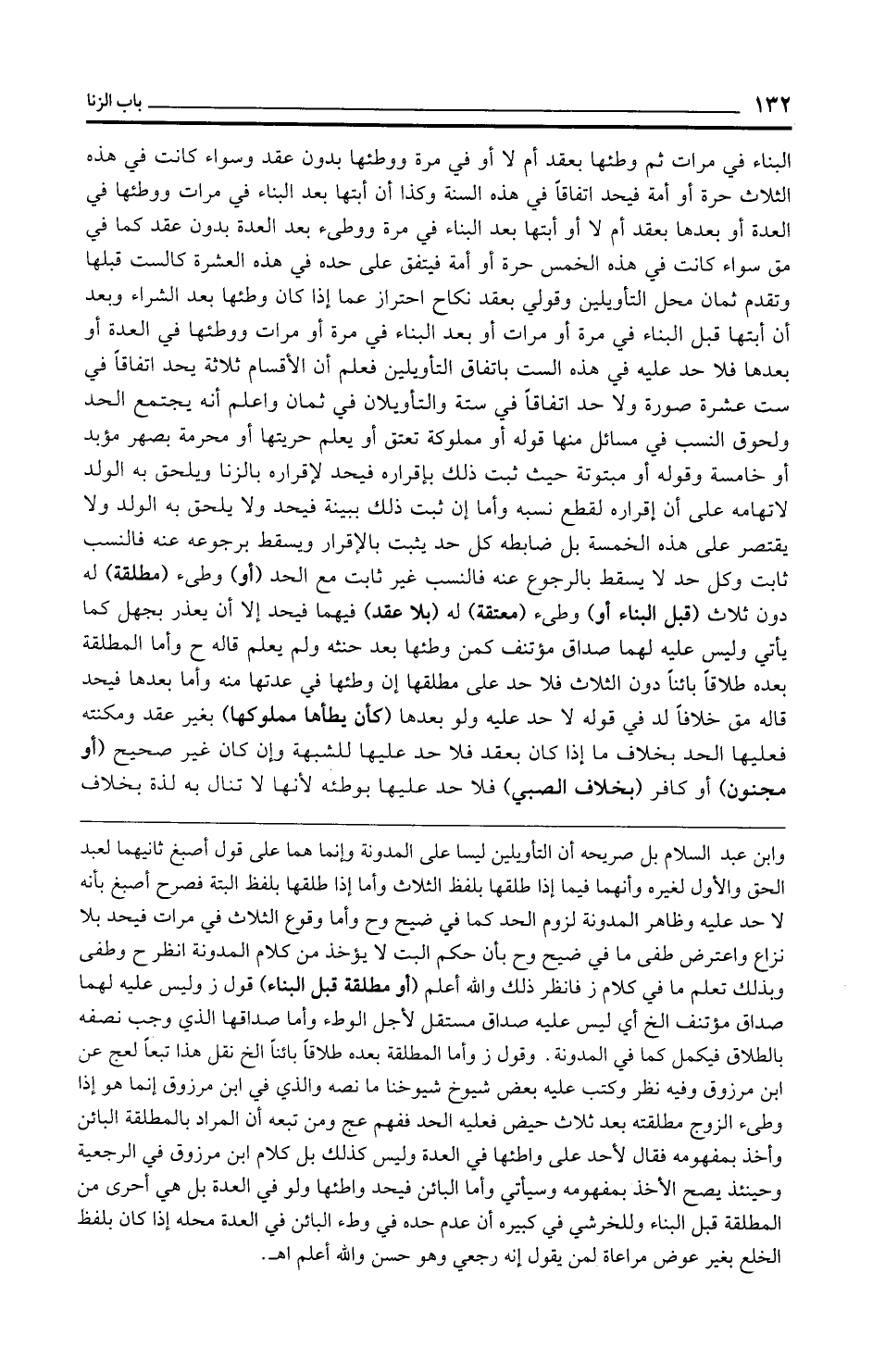 البناء في مرات ثم وطئها بعقد أم لا أو في مرة ووطئها بدون عقد وسواء كانت في هذه الثلاث حرة أو أمة فيحد اتفاقًا في هذه السنة وكذا أن أبتها بعد البناء في مرات ووطئها في العدة أو بعدها بعقد أم لا أو أبتها بعد البناء في مرة ووطىء بعد العدة بدون عقد كما في من سواء كانت في هذه الخمس حرة أو أمة فيتفق على حده في هذه العشرة كالست قبلها وتقدم ثمان محل التأويلين وقولي بعقد نكاح احتراز عما إذا كان وطئها بعد الشراء وبعد أن أبتها قبل البناء في مرة أو مرات أو بعد البناء في مرة أو مرات ووطئها في العدة أو بعدها فلا حد عليه في هذه الست باتفاق التأويلين فعلم أن الأقسام ثلاثة يحد اتفاقًا في ست عشرة صورة ولا حد اتفاقًا في ستة والتأويلان في ثمان واعلم أنه يجتمع الحد ولحوق النسب في مسائل منها قوله أو مملوكة تعتق أو يعلم حريتها أو محرمة بصهر مؤبد أو خامسة وقوله أو مبتوتة حيث ثبت ذلك بإقراره فيحد لإقراره بالزنا ويلحق به الولد لاتهامه على أن إقراره لقطع نسبه وأما إن ثبت ذلك ببينة فيحد ولا يلحق به الولد ولا يقتصر على هذه الخمسة بل ضابطه كل حد يثبت بالإقرار ويسقط برجوعه عنه فالنسب ثابت وكل حد لا يسقط بالرجوع عنه فالنسب غير ثابت مع الحد (أو) وطئ (مطلقة) له دون ثلاث (قبل البناء أو) وطئ (معتقة) له (بلا عقد) فيهما فيحد إلا أن يعذر بجهل كما يأتي وليس عليه لهما صداق مؤتنف كمن وطئها بعد حنثه ولم يعلم قاله ح وأما المطلقة بعده طلاقًا بائنًا دون الثلاث فلا حد على مطلقها إن وطئها في عدتها منه وأما بعدها فيحد قاله مق خلافًا لد في قوله لا حد عليه ولو بعدها (كأن يطأها مملوكها) بغير عقد ومكنته فعليها الحد بخلاف ما إذا كان بعقد فلا حد عليها للشبهة وإن كان غير صحيح (أو مجنون) أو كافر (بخلاف الصبي) فلا حد عليها بوطئه لأنها لا تنال به لذة بخلاف