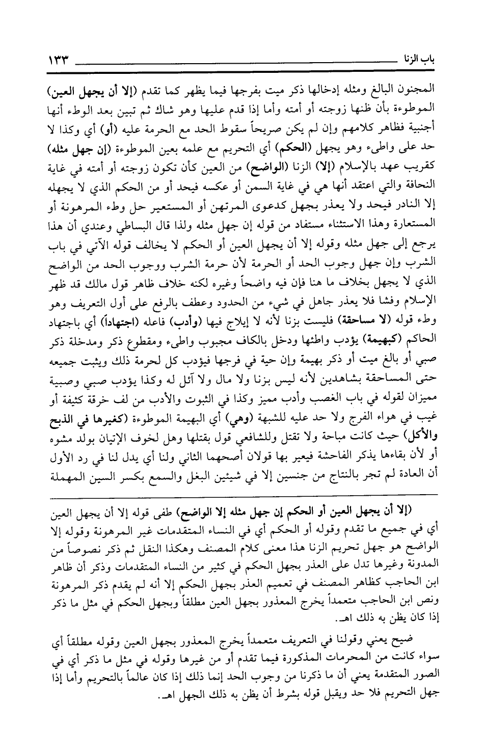 المجنون البالغ ومثله إدخالها ذكر ميت بفرجها فيما يظهر كما تقدم (إلا أن يجهل العين) الموطوءة بأن ظنها زوجته أو أمته وأما إذا قدم عليها وهو شاك ثم تبين بعد الوطء أنها أجنبية فظاهر كلامهم وإن لم يكن صريحًا سقوط الحد مع الحرمة عليه (أو) أي وكذا لا حد على واطىء وهو يجهل (الحكم) أي التحريم مع علمه بعين الموطوءة (إن جهل مثله) كقريب عهد بالإِسلام (إلا) الزنا (الواضح) من العين كأن تكون زوجته أو أمته في غاية النحافة والتي اعتقد أنها هي في غاية السمن أو عكسه فيحد أو من الحكم الذي لا يجهله إلا النادر فيحد ولا يعذر بجهل كدعوى المرتهن أو المستعير حل وطء المرهونة أو المستعارة وهذا الاستثناء مستفاد من قوله إن جهل مثله ولذا قال البساطي وعندي أن هذا يرجع إلى جهل مثله وقوله إلا أن يجهل العين أو الحكم لا يخالف قوله الآتي في باب الشرب وإن جهل وجوب الحد أو الحرمة لأن حرمة الشرب ووجوب الحد من الواضح الذي لا يجهل بخلاف ما هنا فإن فيه واضحًا وغيره لكنه خلاف ظاهر قول مالك قد ظهر الإِسلام وفشا فلا يعذر جاهل في شيء من الحدود وعطف بالرفع على أول التعريف وهو وطء قوله (لا مساحقة) فليست بزنا لأنه لا إيلاج فيها (وأدب) فاعله (اجتهادًا) أي باجتهاد الحاكم (كبهيمة) يؤدب واطئها ودخل بالكاف مجبوب واطىء ومقطوع ذكر ومدخلة ذكر صبي أو بالغ ميت أو ذكر بهيمة وإن حية في فرجها فيؤدب كل لحرمة ذلك ويثبت جميعه حتى المساحقة بشاهدين لأنه ليس بزنا ولا مال ولا آئل له وكذا يؤدب صبي وصبية مميزان لقوله في باب الغصب وأدب مميز وكذا في الثبوت والأدب من لف خرقة كثيفة أو غيب في هواء الفرج ولا حد عليه للشبهة (وهي) أي البهيمة الموطوءة (كغيرها في الذبح والأكل) حيث كانت مباحة ولا تقتل وللشافعي قول بقتلها وهل لخوف الإتيان بولد مشوه أو لأن بقاءها يذكر الفاحشة فيعير بها قولان أصحهما الثاني ولنا أي يدل لنا في رد الأول أن العادة لم تجر بالنتاج من جنسين إلا في شيئين البغل والسمع بكسر السين المهملة
