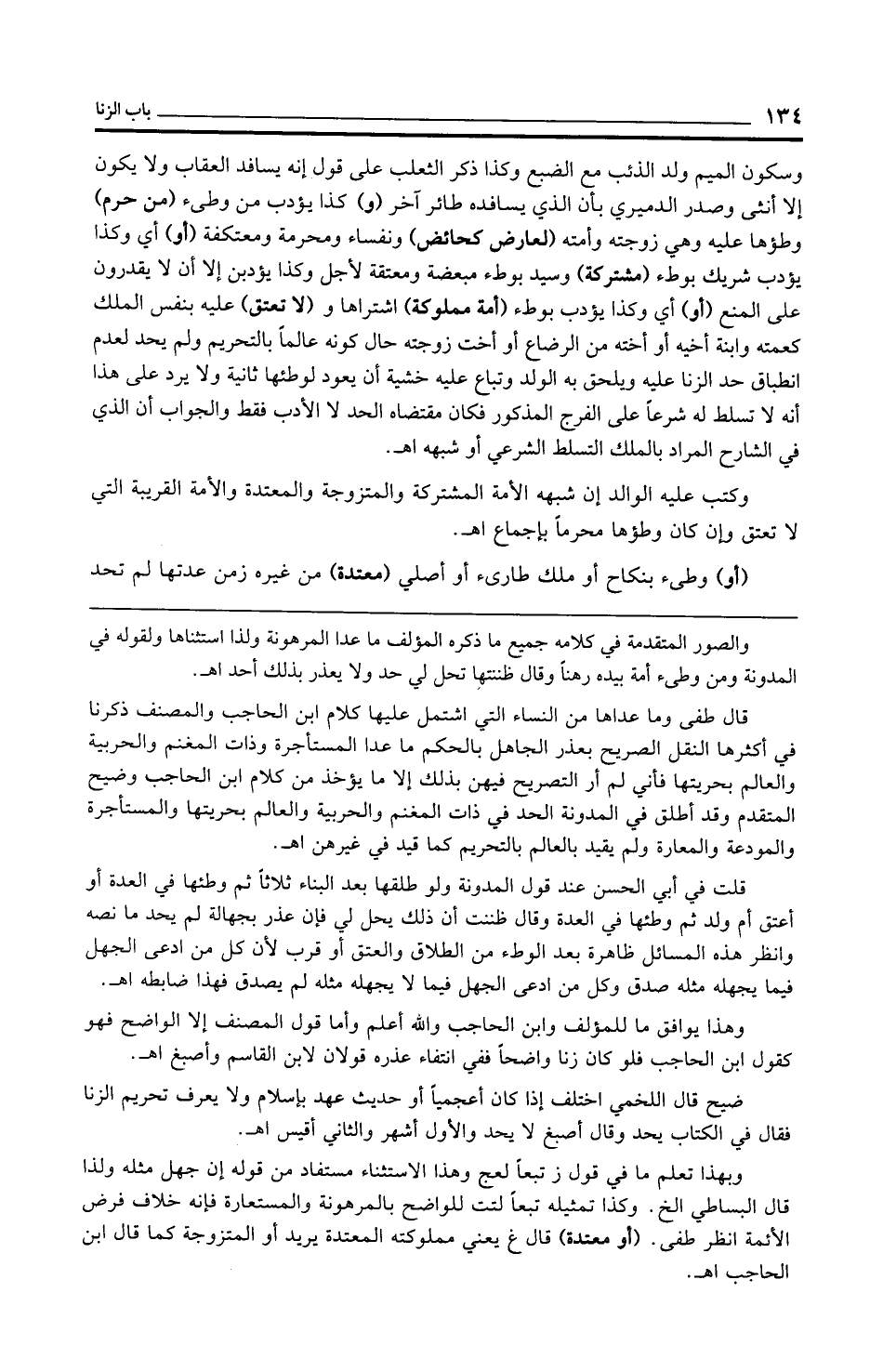 وسكون الميم ولد الذئب مع الضبع وكذا ذكر الثعلب على قول إنه يسافد العقاب ولا يكون إلا أنثى وصدر الدميري بأن الذي يسافده طائر آخر (و) كذا يؤدب من وطئ (من حرم) وطؤها عليه وهي زوجته وأمته (لعارض كحائض) ونفساء ومحرمة ومعتكفة (أو) أي وكذا يؤدب شريك بوطء (مشتركة) وسيد بوطء مبعضة ومعتقة لأجل وكذا يؤدبن إلا أن لا يقدرون على المنع (أو) أي وكذا يؤدب بوطء (أمة مملوكة) اشتراها و (لا تعتق) عليه بنفس الملك كعمته وابنة أخيه أو أخته من الرضاع أو أخت زوجته حال كونه عالمًا بالتحريم ولم يحد لعدم انطباق حد الزنا عليه ويلحق به الولد وتباع عليه خشية أن يعود لوطئها ثانية ولا يرد على هذا أنه لا تسلط له شرعًا على الفرج المذكور فكان مقتضاه الحد لا الأدب فقط والجواب أن الذي في الشارح المراد بالملك التسلط الشرعي أو شبهه اهـ.