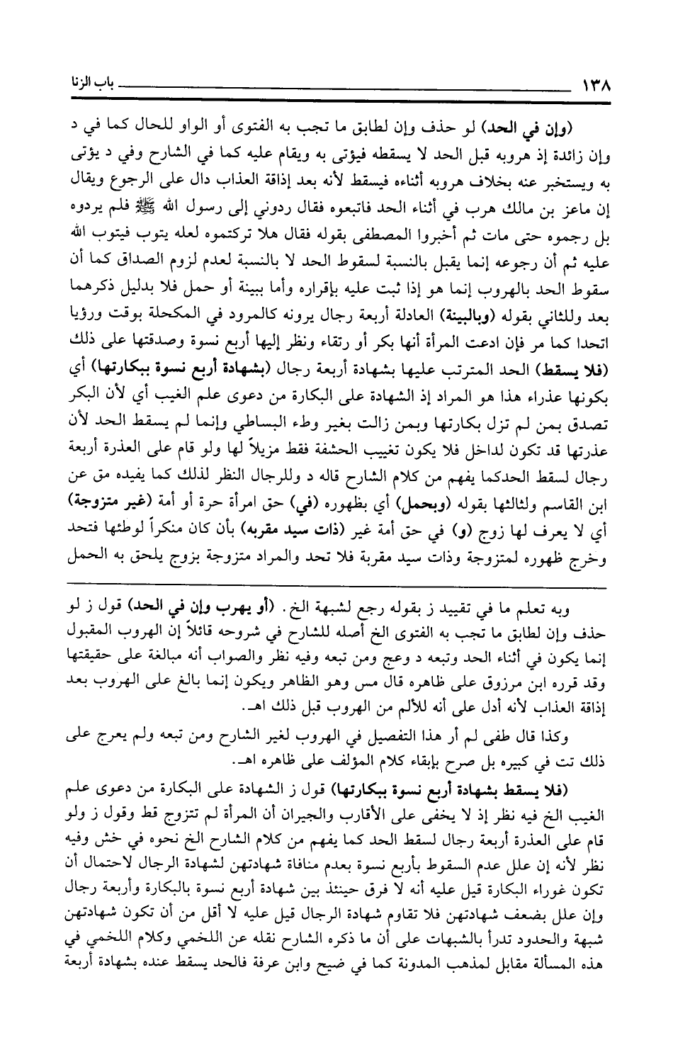 (فلا يسقط بشهادة أربع نسوة ببكارتها) قول ز الشهادة على البكارة من دعوى علم الغيب الخ فيه نظر إذ لا يخفى على الأقارب والجيران أن المرأة لم تتزوج قط وقول ز ولو قام على العذرة أربعة رجال لسقط الحد كما يفهم من كلام الشارح الخ نحوه في خش وفيه نظر لأنه إن علل عدم السقوط بأربع نسوة بعدم منافاة شهادتهن لشهادة الرجال لاحتمال أن تكون غوراء البكارة قيل عليه أنه لا فرق حينئذ بين شهادة أربع نسوة بالبكارة وأربعة رجال وإن علل بضعف شهادتهن فلا تقاوم شهادة الرجال قيل عليه لا أقل من أن تكون شهادتهن شبهة والحدود تدرأ بالشبهات على أن ما ذكره الشارح نقله عن اللخمي وكلام اللخمي في هذه المسألة مقابل لمذهب المدونة كما في ضيح وابن عرفة فالحد يسقط عنده بشهادة أربعة