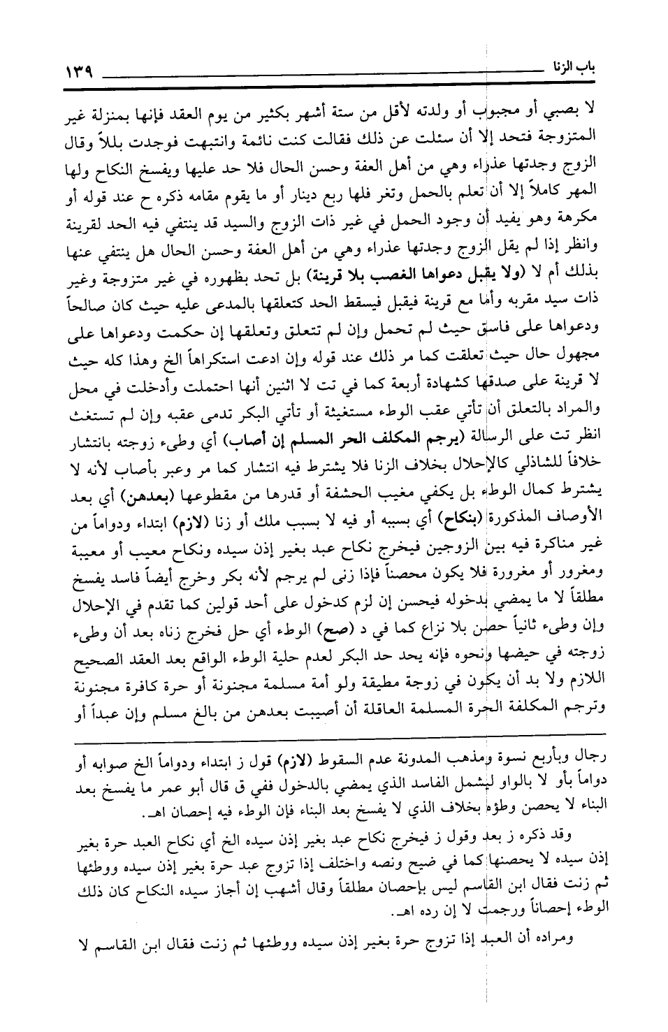 لا بصبي أو مجبوب أو ولدته لأقل من ستة أشهر بكثير من يوم العقد فإنها بمنزلة غير المتزوجة فتحد إلا أن سئلت عن ذلك فقالت كنت نائمة وانتبهت فوجدت بللًا وقال الزوج وجدتها عذراء وهي من أهل العفة وحسن الحال فلا حد عليها ويفسخ النكاح ولها المهر كاملًا إلا أن تعلم بالحمل وتغر فلها ربع دينار أو ما يقوم مقامه ذكره ح عند قوله أو مكرهة وهو يفيد أن وجود الحمل في غير ذات الزوج والسيد قد ينتفي فيه الحد لقرينة وانظر إذا لم يقل الزوج وجدتها عذراء وهي من أهل العفة وحسن الحال هل ينتفي عنها بذلك أم لا (ولا يقبل دعواها الغصب بلا قرينة) بل تحد بظهوره في غير متزوجة وغير ذات سيد مقربه وأما مع قرينة فيقبل فيسقط الحد كتعلقها بالمدعى عليه حيث كان صالحًا ودعواها على فاسق حيث لم تحمل وإن لم تتعلق وتعلقها إن حكمت ودعواها على مجهول حال حيث تعلقت كما مر ذلك عند قوله وإن ادعت استكراهًا الخ وهذا كله حيث لا قرينة على صدقها كشهادة أربعة كما في تت لا اثنين أنها احتملت وأدخلت في محل والمراد بالتعلق أن تأتي عقب الوطء مستغيثة أو تأتي البكر تدمى عقبه وإن لم تستغث انظر تت على الرسالة (يرجم المكلف الحر المسلم إن أصاب) أي وطئ زوجته بانتشار خلافًا للشاذلي كالإحلال بخلاف الزنا فلا يشترط فيه انتشار كما مر وعبر بأصاب لأن لا يشترط كمال الوطء بل يكفي مغيب الحشفة أو قدرها من مقطوعها (بعدهن) أي بعد الأوصاف المذكورة (بنكاح) أي بسببه أو فيه لا بسبب ملك أو زنا (لازم) ابتداء ودوامًا من غير مناكرة فيه بين الزوجين فيخرج نكاح عبد بغير إذن سيده ونكاح معيب أو معيبة ومغرور أو مغرورة فلا يكون محصنًا فإذا زنى لم يرجم لأنه بكر وخرج أيضًا فاسد يفسخ مطلقًا لا ما يمضي بدخوله فيحسن إن لزم كدخول على أحد قولين كما تقدم في الإحلال وإن وطئ ثانيًا حصن بلا نزاع كما في د (صح) الوطء أي حل فخرج زناه بعد أن وطئ زوجته في حيضها ونحوه فإنه يحد حد البكر لعدم حلية الوطء الواقع بعد العقد الصحيح اللازم ولا بد أن يكون في زوجة مطيقة ولو أمة مسلمة مجنونة أو حرة كافرة مجنونة وترجم المكلفة الحرة المسلمة العاقلة أن أصيبت بعدهن من بالغ مسلم وإن عبدًا أو