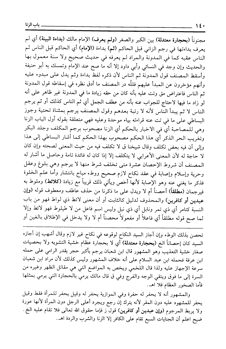 مجنونًا (بحجارة معتدلة) بين الكبر والصغر (ولم يعرف) الإِمام مالك (بداءة البينة) أي لم يعرف بداءتها في رجم الزاني قبل الحاكم (ثم) بداءة (الإِمام) أي الحاكم قبل الناس ثم الناس عقبه كما في المدونة والمراد لم يعرفه في حديث صحيح ولا سنة معمول بها والحديث وإن وجد في النسائي وأبي داود إلا أنه ما صح عند الإمام وتمسك به أبو حنيفة وأسقط المصنف قول المدونة ثم الناس لأن ذكره لفظ بداءة وثم يدل على مبدوء عليه وأنهم مؤخرون عن المبدأ عليهم فللَّه در المصنف ما أدق نظره في إسقاطه قول المدونة ثم الناس فاعتراض مق وتت عليه بأنه كان من حقه زيادة ما في المدونة غير ظاهر على أنه لو زاد ما فيها لاحتاج للجواب عنه بأنه من عطف الجمل أي ثم الناس كذلك أو ثم يرجم الناس لا ثم يبدأ الناس لأنه لا رتبة بعدهم وقول المصنف يرجم بمثناة تحتية وجوز البساطي على ما في تت عنه قراءته بياء موحدة وعليه فهي متعلقة بقوله أول الباب الزنا وهي للمصاحبة أي في الأخبار بالحكم أي الزنا مصحوب برجم المكلف وجلد البكر وتغريب الحر الذكر أي هذا الحكم مصحوب بهذا الحكم كما أشار البساطي إلى هذا وإلى أن فيه بعض تكلف وقال شيخنا ق لا تكلف فيه من حيث المعنى لصحته وإن كان لا حاجة له لأن المعنى الأعرابي لا يتكلف إلا إذا كان له فائدة تامة وحاصل ما أشار له المصنف أن شروط الإحصان عشرة متى تخلف شرط منها لا يرجم وهي بلوغ وعقل وحرية وإسلام وإصابة في عقد نكاح لازم صحيح ووطء مباح بانتشار وأما علم الخلوة فذكر ما يغني عنه وهو الإصابة لأنها أخص ويأتي ذلك قريبًا مع زيادة (كلائط) وملوط به فيرجمان (مطلقًا) أحصنًا أم لا ويدل على ما ذكرنا من حذف عاطف ومعطوف قوله (وإن عبدين أو كافرين) والمحذوف لدليل كالثابت أو أن معنى لائط ذي لواط فهو من باب النسبة كتامر أي ذي تمر ونابل أي ذي نبل وليس اسم فاعل من لا طيلوط فهو لائط وإلا لما صح قوله مطلقًا أي فاعلًا أو مفعولًا محصنًا أم لا ولا يدخل في الإطلاق بالغين أو