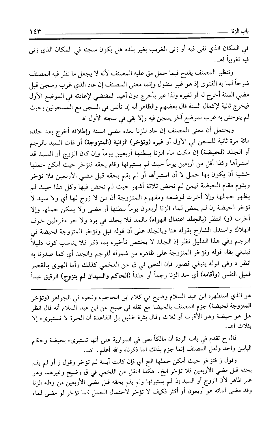 ويحتمل أن معنى المصنف إن عاد للزنا بعده مضي السنة وإطلاقه أخرج بعد جلده مائة مرة ثانية للسجن في الأول أو غيره (وتؤخر) الزانية (المتزوجة) أو ذات السيد بالرجم أو الجلد (لحيضة) إن مكث ماء الزنا ببطنها أربعين يومًا وإن كان الزوج أو السيد قد استبرأها وكذا أقل من أربعين يومًا حيث لم يستبرئها وقام بحقه فتؤخر حيث أمكن حملها خشية أن يكون بها حمل لا أن استبرأها أو لم يقم بحقه قبل مضي الأربعين فلا تؤخر ويقوم مقام الحيضة فيمن لم تحض ثلاثة أشهر حيث لم تحض فيها وكل هذا حيث لم يظهر حملها وإلا أخرت لوضعه ومفهوم المتزوجة أن من لا زوج لها أي ولا سيد لا تؤخر لحيضة إن لم يمض لماء الزنا أربعون يومًا ببطنها أو مضى ولا يمكن حملها وإلا أخرت (و) انتظر (بالجلد اعتدال الهواء) بالمد فلا يجلد في برد ولا حر مفرطين خوف الهلاك واستدل الشارح بقوله هنا وبالجلد على أن قوله قبل وتؤخر المتزوجة لحيضة في الرجم وفي هذا الدليل نظر إذ الجلد لا يختص تأخيره بما ذكر فلا يناسب كونه دليلًا فينبغي بقاء قوله وتؤخر المتزوجة على ظاهره من شموله للرجم والجلد أي كما صدرنا به انظر د وفي قوله ينبغي قصور فإن النص في ق عن اللخمي كذلك وأما الهوى بالقصر فميل النفس (وأقامه) أي حد الزنا رجمًا أو جلدًا (الحاكم والسيدان لم يتزوج) الرقيق عبدًا