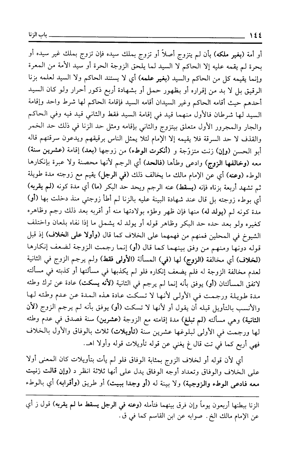 أو أمة (بغير ملكه) بأن لم يتزوج أصلًا أو تزوج بملك سيده فإن تزوج بملك غير سيده أو بحرة لم يقمه عليه إلا الحاكم لا السيد لما يلحق الزوجة الحرة أو سيد الأمة من المعرفة وإنما يقيمه كل من الحاكم والسيد (بغير علمه) أي لا يستند الحاكم ولا السيد لعلمه بزنا الرقيق بل لا بد من إقراره أو بظهور حمل أو بشهادة أربع ذكور أحرار ولو كان السيد أحدهم حيث أقامه الحاكم وغير السيدان أقامه السيد فإقامة الحاكم لها شرط واحد وإقامة السيد لها شرطان فالأول منهما قيد في إقامة السيد فقط والثاني قيد فيه وفي الحاكم والجار والمجرور الأول متعلق بيتزوج والثاني بإقامه ومثل حد الزنا في ذلك حد الخمر والقذف لا حد السرقة فلا يقيمه إلا الإِمام لئلا يمثل الناس برقيقهم ويدعون سرقتهم قاله أبو الحسن (وإن) زنت متزوجة و (أنكرت الوطء) من زوجها (بعد) إقامة (عشرين سنة) معه (وخالفها الزوج) وادعى وطأها (فالحد) أي الرجم لأنها محصنة ولا عبرة بإنكارها الوطء (وعنه) أي عن الإِمام مالك ما يخالف ذلك (في الرجل) يقيم مع زوجته مدة طويلة ثم تشهد أربعة بزناه فإنه (يسقط) عنه الرجم ويحد حد البكر (ما) أي مدة كونه (لم يقربه) أي بوطء زوجته بل قال عند شهادة البينة عليه بالزنا لم أطأ زوجتي منذ دخلت بها (أو) مدة كونه لم (يولد له) منها فإن ظهر وطؤه بولادتها منه أو أقربه بعد ذلك رجم وظاهره كغيره ولو بعد حده حد البكر وظاهر قوله أو يولد له يشمل ما إذا نفاه بلعان واختلف الشيوخ في المحلين فمنهم من فهمهما على الخلاف كما قال (وأولا على الخلاف) إذ قبل قوله دونها ومنهم من وفق بينهما كما قال (أو) إنما رجمت الزوجة لضعف إنكارها (لخلاف) أي مخالفة (الزوج) لها (في) المسألة (الأولى ققط) ولم يرجم الزوج في الثانية لعدم مخالفة الزوجة له فلم يضعف إنكاره فلو لم يكذبها في مسألتها أو كذبته في مسألته لاتفق المسألتان (أو) يوفق بأنه إنما لم يرجم في الثانية (لأنه يسكت) عادة عن ترك وطئه مدة طويلة ورجمت في الأولى لأنها لا تسكت عادة هذه المدة عن عدم وطئه لها والأنسب بالتأويل قبله أن يقول أو لأنها لا تسكت (أو) يوفق بأنه لم يرجم الزوج (لأن الثانية) وهي مسألته (لم تبلغ) مدة إقامته مع الزوجة (عشرين) سنة فصدق في عدم وطئه لها ورجمت في الأولى لبلوغها عشرين سنة (تأويلات) ثلاث بالوفاق والأول بالخلاف فهي أربع كما في تت قال غ يغني عن قوله تأويلات قوله وأولا اهـ.