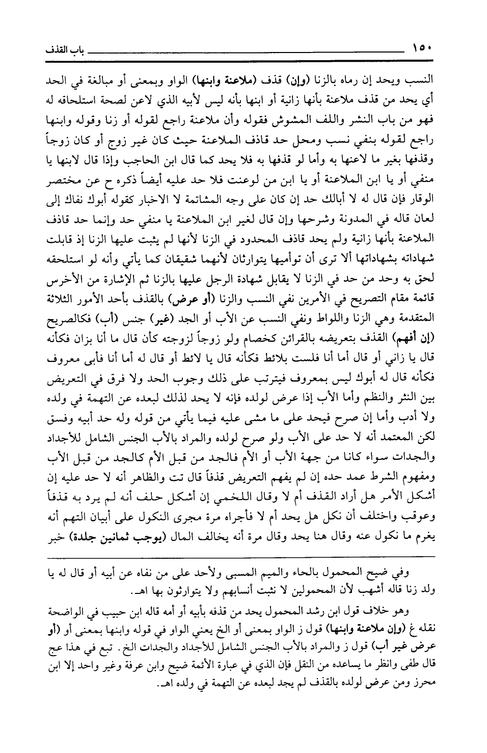 النسب ويحد إن رماه بالزنا (وإن) قذف (ملاعنة وابنها) الواو وبمعنى أو مبالغة في الحد أي يحد من قذف ملاعنة بأنها زانية أو ابنها بأنه ليس لأبيه الذي لاعن لصحة استلحاقه له فهو من باب النشر واللف المشوش فقوله وأن ملاعنة راجع لقوله أو زنا وقوله وابنها راجع لقوله بنفي نسب ومحل حد قاذف الملاعنة حيث كان غير زوج أو كان زوجًا وقذفها بغير ما لاعنها به وأما لو قذفها به فلا يحد كما قال ابن الحاجب وإذا قال لابنها يا منفي أو يا ابن الملاعنة أو يا ابن من لوعنت فلا حد عليه أيضًا ذكره ح عن مختصر الوقار فإن قال له لا أبا لك حد إن كان على وجه المشاتمة لا الإخبار كقوله أبوك نفاك إلى لعان قاله في المدونة وشرحها وإن قال لغير ابن الملاعنة يا منفي حد وإنما حد قاذف الملاعنة بأنها زانية ولم يحد قاذف المحدود في الزنا لأنها لم يثبت عليها الزنا إذ قابلت شهاداته بشهاداتها ألا ترى أن توأميها يتوارثان لأنهما شقيقان كما يأتي وأنه لو استلحقه لحق به وحد من حد في الزنا لا يقابل شهادة الرجل عليها بالزنا ثم الإشارة من الأخرس قائمة مقام التصريح في الأمرين نفي النسب والزنا (أو عرض) بالقذف بأحد الأمور الثلاثة المتقدمة وهي الزنا واللواط ونفي النسب عن الأب أو الجد (غير) جنس (أب) فكالصريح (إن أفهم) القذف بتعريضه بالقرائن كخصام ولو زوجًا لزوجته كأن قال ما أنا بزان فكأنه قال يا زاني أو قال أما أنا فلست بلائط فكأنه قال يا لائط أو قال له أما أنا فأبى معروف فكأنه قال له أبوك ليس بمعروف فيترتب على ذلك وجوب الحد ولا فرق في التعريض بين النثر والنظم وأما الأب إذا عرض لولده فإنه لا يحد لذلك لبعده عن التهمة في ولده ولا أدب وأما إن صرح فيحد على ما مشى عليه فيما يأتي من قوله وله حد أبيه وفسق لكن المعتمد أنه لا حد على الأب ولو صرح لولده والمراد بالأب الجنس الشامل للأجداد والجدات سواء كانا من جهة الأب أو الأم فالجد من قبل الأم كالجد من قبل الأب ومفهوم الشرط عمد حده إن لم يفهم التعريض قذفًا قال تت والظاهر أنه لا حد عليه إن أشكل الأمر هل أراد القذف أم لا وقال اللخمي إن أشكل حلف أنه لم يرد به قذفًا وعوقب واختلف أن نكل هل يحد أم لا فأجراه مرة مجرى النكول على أبيان التهم أنه يغرم ما نكول عنه وقال هنا يحد وقال مرة أنه يخالف المال (يوجب ثمانين جلدة) خبر