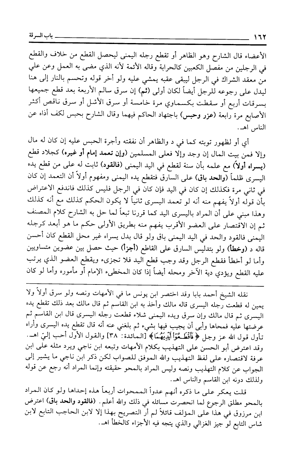 الأعضاء قال الشارح وهو الظاهر أو تقطع رجله اليمنى ليحصل القطع من خلاف والقطع في الرجلين من مفصل الكعبين كالحرابة وقاله الأئمة لأنه الذي مضى به العمل وعن علي من معقد الشراك في الرجل ليبقى عقبه يمشي عليه ولو أخر قوله وتحسم بالنار إلى هنا ليدل على رجوعه للرجل أيضًا لكان أولى (ثم) إن سرق سالم الأربعة بعد قطع جميعها بسرقات أربع أو سقطت بكسماوي مرة خامسة أو سرق الأشل أو سرق ناقص أكثر الأصابع مرة رابعة (عزر وحبس) باجتهاد الحاكم فيهما وقال الشارح بحبس لكف أذاه عن الناس اهـ.
