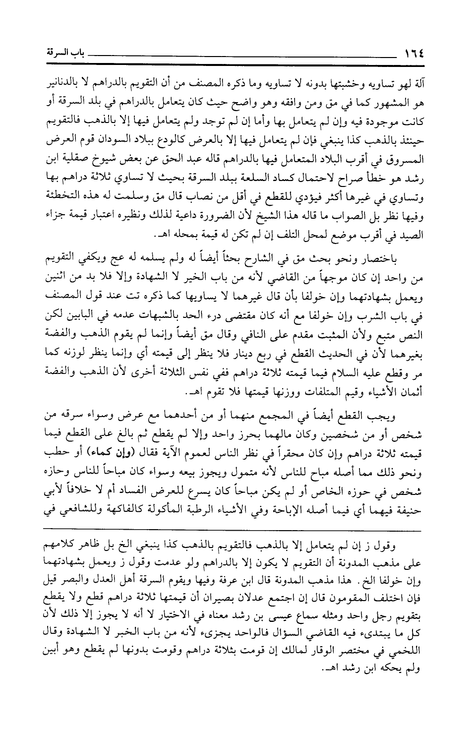 ويجب القطع أيضًا في المجمع منهما أو من أحدهما مع عرض وسواء سرقه من شخص أو من شخصين وكان مالهما بحرز واحد وإلا لم يقطع ثم بالغ على القطع فيما قيمته ثلاثة دراهم وإن كان محقرًا في نظر الناس لعموم الآية فقال (وإن كماء) أو حطب ونحو ذلك مما أصله مباح للناس لأنه متمول ويجوز بيعه وسواء كان مباحًا للناس وحازه شخص في حوزه الخاص أو لم يكن مباحًا كان يسرع للعرض الفساد أم لا خلافًا لأبي حنيفة فيهما أي فيما أصله الإباحة وفي الأشياء الرطبة المأكولة كالفاكهة وللشافعي في