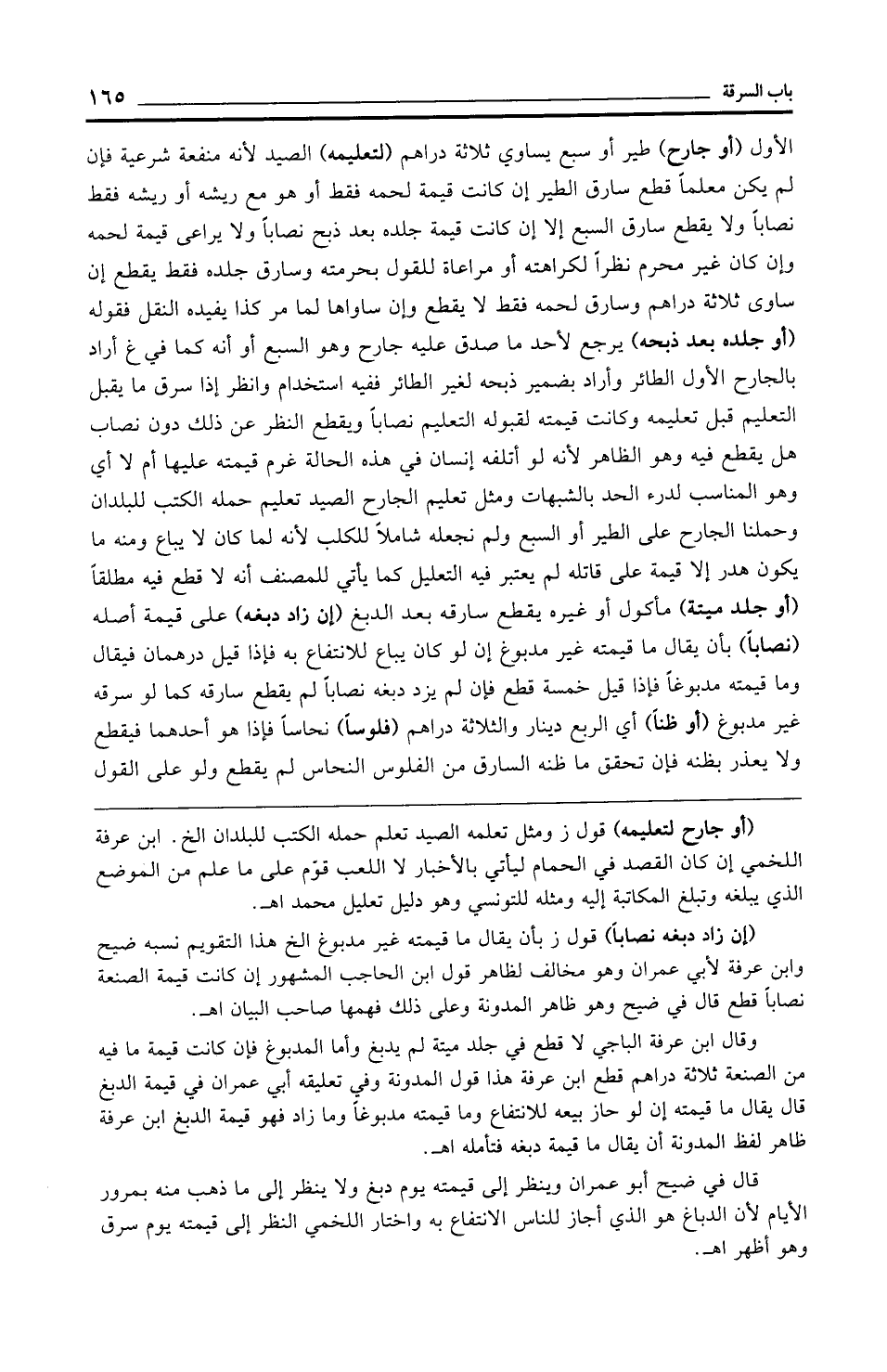 الأول (أو جارح) طير أو سبع يساوي ثلاثة دراهم (لتعليمه) الصيد لأنه منفعة شرعية فإن لم يكن معلمًا قطع سارق الطير إن كانت قيمة لحمه فقط أو هو مع ريشه أو ريشه فقط نصابًا ولا يقطع سارق السبع إلا إن كانت قيمة جلده بعد ذبح نصابًا ولا يراعى قيمة لحمه وإن كان غير محرم نظرًا لكراهته أو مراعاة للقول بحرمته وسارق جلده فقط يقطع إن ساوى ثلاثة دراهم وسارق لحمه فقط لا يقطع وإن ساواها لما مر كذا يفيده النقل فقوله (أو جلده بعد ذبحه) يرجع لأحد ما صدق عليه جارح وهو السبع أو أنه كما في غ أراد بالجارح الأول الطائر وأراد بضمير ذبحه لغير الطائر ففيه استخدام وانظر إذا سرق ما يقبل التعليم قبل تعليمه وكانت قيمته لقبوله التعليم نصابًا ويقطع النظر عن ذلك دون نصاب هل يقطع فيه وهو الظاهر لأنه لو أتلفه إنسان في هذه الحالة غرم قيمته عليها أم لا أي وهو المناسب لدرء الحد بالشبهات ومثل تعليم الجارح الصيد تعليم حمله الكتب للبلدان وحملنا الجارح على الطير أو السبع ولم نجعله شاملًا للكلب لأنه لما كان لا يباع ومنه ما يكون هدر إلا قيمة على قاتله لم يعتبر فيه التعليل كما يأتي للمصنف أنه لا قطع فيه مطلقًا (أو جلد ميتة) مأكول أو غيره يقطع سارقه بعد الدبغ (إن زاد دينه) على قيمة أصله (نصابًا) بأن يقال ما قيمته غير مدبوغ إن لو كان يباع للانتفاع به فإذا قيل درهمان فيقال وما قيمته مدبوغًا فإذا قيل خمسة قطع فإن لم يزد دبغه نصابًا لم يقطع سارقه كما لو سرقه غير مدبوغ (أو ظنًّا) أي الربع دينار والثلاثة دراهم (فلوسًا) نحاسًا فإذا هو أحدهما فيقطع ولا يعذر بظنه فإن تحقق ما ظنه السارق من الفلوس النحاس لم يقطع ولو على القول
