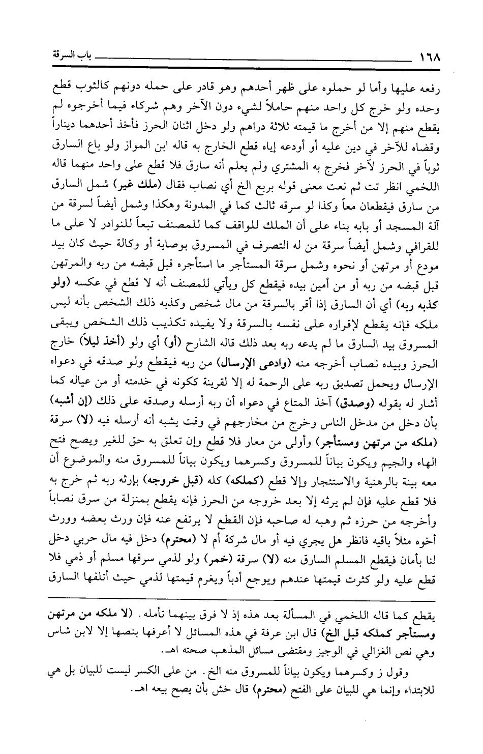 رفعه عليها وأما لو حملوه على ظهر أحدهم وهو قادر على حمله دونهم كالثوب قطع وحده ولو خرج كل واحد منهم حاملًا لشيء دون الآخر وهم شركاء فيما أخرجوه لم يقطع منهم إلا من أخرج ما قيمته ثلاثة دراهم ولو دخل اثنان الحرز فأخذ أحدهما دينارًا وقضاه للآخر في دين عليه أو أودعه إياه قطع الخارج به قاله ابن المواز ولو باع السارق ثوبًا في الحرز لآخر فخرج به المشتري ولم يعلم أنه سارق فلا قطع على واحد منهما قاله اللخمي انظر تت ثم نعت معنى قوله بربع الخ أي نصاب فقال (ملك غير) شمل السارق من سارق فيقطعان معًا وكذا لو سرقه ثالث كما في المدونة وهكذا وشمل أيضًا لسرقة من آلة المسجد أو بابه بناء على أن الملك للواقف كما للمصنف تبعًا للنوادر لا على ما للقرافي وشمل أيضًا سرقة من له التصرف في المسروق بوصاية أو وكالة حيث كان بيد مودع أو مرتهن أو نحوه وشمل سرقة المستأجر ما استأجره قبل قبضه من ربه والمرتهن قبل قبضه من ربه أو من أمين بيده فيقطع كل ويأتي للمصنف أنه لا قطع في عكسه (ولو كذبه ربه) أي أن السارق إذا أقر بالسرقة من مال شخص وكذبه ذلك الشخص بأنه ليس ملكه فإنه يقطع لإقراره على نفسه بالسرقة ولا يفيده تكذيب ذلك الشخص ويبقى المسروق بيد السارق ما لم يدعه ربه بعد ذلك قاله الشارح (أو) أي ولو (أخذ ليلًا) خارج الحرز وبيده نصاب أخرجه منه (وادعى الإرسال) من ربه فيقطع ولو صدقه في دعواه الإرسال ويحمل تصديق ربه على الرحمة له إلا لقرينة ككونه في خدمته أو من عياله كما أشار له بقوله (وصدق) آخذ المتاع في دعواه أن ربه أرسله وصدقه على ذلك (إن أشبه) بأن دخل من مدخل الناس وخرج من مخارجهم في وقت يشبه أنه أرسله فيه (لا) سرقة (ملكه من مرتهن ومستأجر) وأولى من معار فلا قطع وإن تعلق به حق للغير ويصح فتح الهاء والجيم ويكون بيانًا للمسروق وكسرهما ويكون بيانًا للمسروق منه والموضوع أن معه بينة بالرهنية والاستئجار وإلا قطع (كملكه) كله (قبل خروجه) بإرثه ربه ثم خرج به فلا قطع عليه فإن لم يرثه إلا بعد خروجه من الحرز فإنه يقطع بمنزلة من سرق نصابًا وأخرجه من حرزه ثم وهبه له صاحبه فإن القطع لا يرتفع عنه فإن ورث بعضه وورث أخوه مثلًا باقيه فانظر هل يجري فيه أو مال شركة أم لا (محترم) دخل فيه مال حربي دخل لنا بأمان فيقطع المسلم السارق منه (لا) سرقة (خمر) ولو لذمي سرقها مسلم أو ذمي فلا قطع عليه ولو كثرت قيمتها عندهم ويوجع أدبًا ويغرم قيمتها لذمي حيث أتلفها السارق