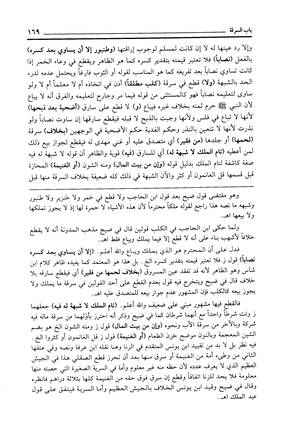 فالقطع فيها مشهور مبني على ضعيف والله أعلم. (تام الملك لا شبهة له فيه) جعلهما ز وتت شرطًا واحدًا مع أنهما شرطان كما في ضيح وذكر أنه احترز بأوّلهما من سرقة ماله فيه شركة وبالآخر من سرقة الأب ونحوه (وإن من بيت المال) قول ز ومنه الشون الخ هو بضم الشين المعجمة وبالنون موضح خزن الطعام (أو الغنيمة) قول ز قل الغانمون أو كثروا الخ. فيه نظر بل لا بد من تقييد ابن يونس المتقدم في الزنا وهنا نقله ابن عرفة ونصه وفي عتقها الثاني من وطئ أمة من الغنيمة أو سرق منها بعد أن تحرز قطع الصقلي هذا في الجيش العظيم الذي لا يعرف عدده لأن حظه منه غير معلوم وأما في السرية الصغيرة التي حصته منها معلومة فلا يحد للزنا اتفاقًا وقطع إن سرق فوق حقه من الغنيمة كلها بثلاثة دراهم فانظره وقال في ضيح وقيد ابن يونس الخلاف بالجيش العظيم وأما السرية فيتفق على قول عبد الملك اهـ.