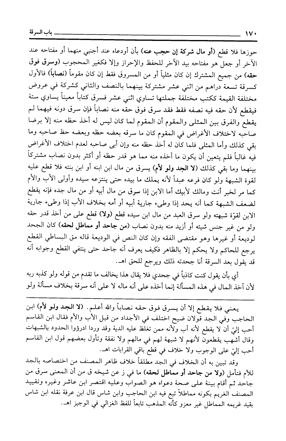 حوزها فلا قطع (أو مال شركة إن حجب عنه) بأن أودعاه عند أجنبي منهما أو مفتاحه عند الآخر أو جعل هو مفتاحه بيد الآخر للحفظ والإحراز وإلا فكغير المحجوب (وسرق فوق حقه) من جميع المشترك إن كان مثليًّا أو من المسروق فقط إن كان مقومًا (نصابًا) فالأول كسرقة تسعة دراهم من اثني عشر مشتركة بينهما بالنصف والثاني كشركة في عروض مختلفة القيمة ككتب مختلفة جملتها تساوي اثني عشر فسرق كتابًا معينًا يساوي ستة فيقطع لأن حقه فيه نصفه فقط فقد سرق فوق حقه منه نصابًا فإن سرق دونه فيهما لم يقطع والفرق بين المثلى والمقوم أن المقوم لما كان ليس له أخذ حظه منه إلا برضا صاحبه لاختلاف الأغراض في المقوم كان ما سرقه بعضه حظه وبعضه حظ صاحبه وما بقي كذلك وأما المثلى فلما كان له أخذ حظه منه وإن أبى صاحبه لعدم اختلاف الأغراض فيه غالبًا فلم يتعين أن يكون ما أخذه منه مما هو قدر حظه أو أكثر بدون نصاب مشتركًا بينهما وما بقي كذلك (لا الجد ولو لأم) يسرق من مال ابن ابنه أو ابن بنته فلا قطع عليه لقوة الشبهة ولو كان فرعه عبدًا لأنه يملك ما بيده حتى ينتزعه سيده وأولى الأب والأم كما مر لخبر أنت ومالك لأبيك أما الابن إذا سرق من مال أبيه أو من مال جده فإنه يقطع لضعف الشبهة كما أنه يحد إذا وطئ جارية أبيه أو أمه بخلاف الأب إذا وطئ جارية الابن لقوّة شبهته ولو سرق العبد من مال ابن سيده قطع (ولا) قطع على من أخذ قدر حقه ولو من غير جنس شيئه أو أزيد منه بدون نصاب (من جاحد أو مماطل لحقه) كان الجحد لوديعة أو غيرها وهو مقتضى الفقه وإن كان النص في الوديعة قاله مق البساطي القطع يرجع للحاكم ولا يحكم إلا بالظاهر فكيف يعرف أنه جاحد حتى ينتفي القطع وجوابه أنه قد يقول بعد السرقة أنا جحدته ذلك ويرجع للحق اهـ.