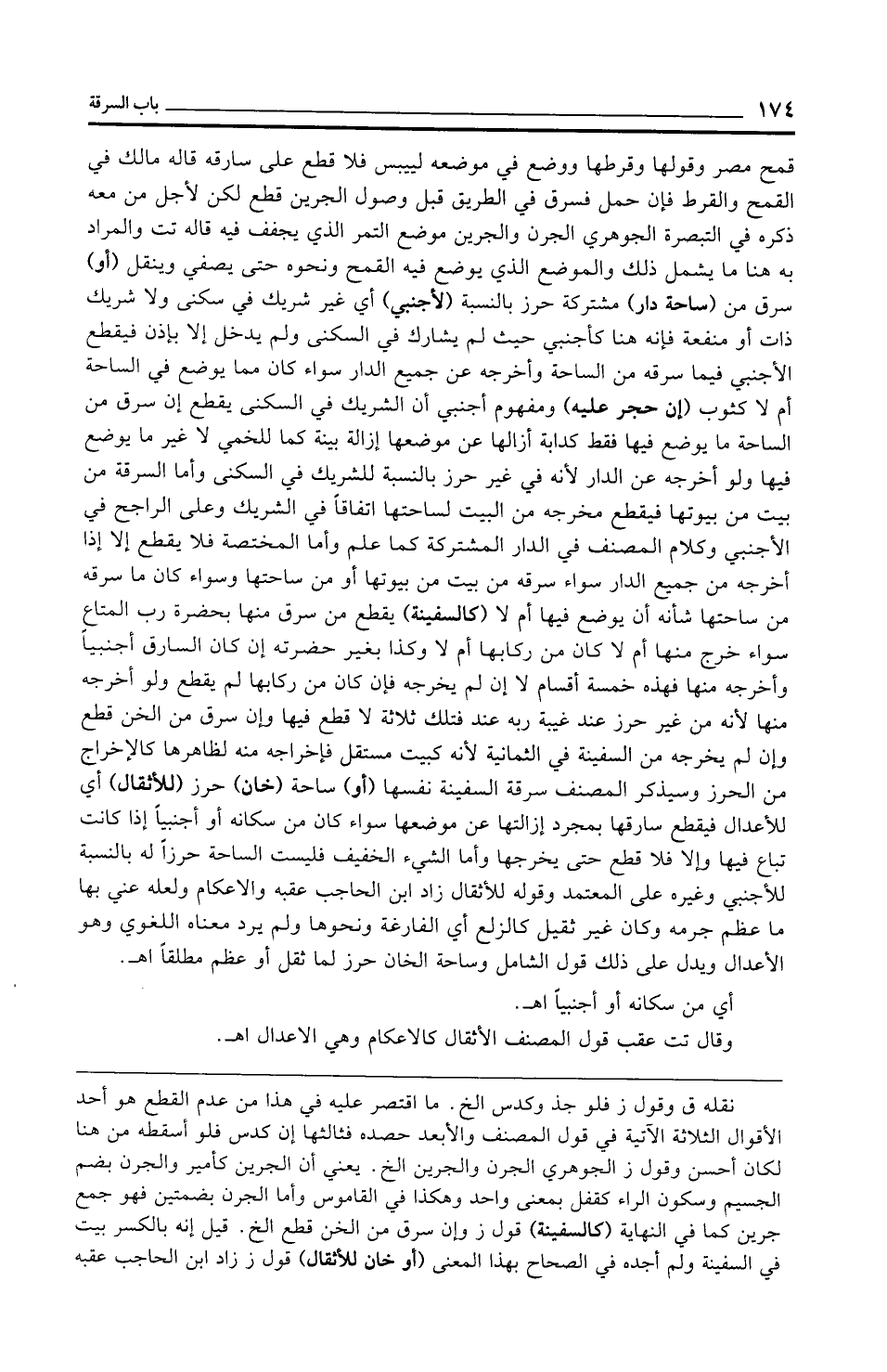 قمح مصر وقولها وقرطها ووضع في موضعه لييبس فلا قطع على سارقه قاله مالك في القمح والقرط فإن حمل فسرق في الطريق قبل وصول الجرين قطع لكن لأجل من معه ذكره في التبصرة الجوهري الجرن والجرين موضع التمر الذي يجفف فيه قاله تت والمراد به هنا ما يشمل ذلك والموضع الذي يوضع فيه القمح ونحوه حتى يصفي وينقل (أو) سرق من (ساحة دار) مشتركة حرز بالنسبة (لأجنبي) أي غير شريك في سكنى ولا شريك ذات أو منفعة فإنه هنا كأجنبي حيث لم يشارك في السكنى ولم يدخل إلا بإذن فيقطع الأجنبي فيما سرقه من الساحة وأخرجه عن جميع الدار سواء كان مما يوضع في الساحة أم لا كثوب (إن حجر عليه) ومفهوم أجنبي أن الشريك في السكنى يقطع إن سرق من الساحة ما يوضع فيها فقط كدابة أزالها عن موضعها إزالة بينة كما للخمي لا غير ما يوضع فيها ولو أخرجه عن الدار لأنه في غير حرز بالنسبة للشريك في السكنى وأما السرقة من بيت من بيوتها فيقطع مخرجه من البيت لساحتها اتفاقًا في الشريك وعلى الراجح في الأجنبي وكلام المصنف في الدار المشتركة كما علم وأما المختصة فلا يقطع إلا إذا أخرجه من جميع الدار سواء سرقه من بيت من بيوتها أو من ساحتها وسواء كان ما سرقه من ساحتها شأنه أن يوضع فيها أم لا (كالسفينة) يقطع من سرق منها بحضرة رب المتاع سواء خرج منها أم لا كان من ركابها أم لا وكذا بغير حضرته إن كان السارق أجنبيًّا وأخرجه منها فهذه خمسة أقسام لا إن لم يخرجه فإن كان من ركابها لم يقطع ولو أخرجه منها لأنه من غير حرز عند غيبة ربه عند فتلك ثلاثة لا قطع فيها وإن سرق من الخن قطع وإن لم يخرجه من السفينة في الثمانية لأنه كبيت مستقل فإخراجه منه لظاهرها كالإخراج من الحرز وسيذكر المصنف سرقة السفينة نفسها (أو) ساحة (خان) حرز (للأثقال) أي للأعدال فيقطع سارقها بمجرد إزالتها عن موضعها سواء كان من سكانه أو أجنبيًّا إذا كانت تباع فيها وإلا فلا قطع حتى يخرجها وأما الشيء الخفيف فليست الساحة حرزًا له بالنسبة للأجنبي وغيره على المعتمد وقوله للأثقال زاد ابن الحاجب عقبه والأعكام ولعله عني بها ما عظم جرمه وكان غير ثقيل كالزلع أي الفارغة ونحوها ولم يرد معناه اللغوي وهو الأعدال ويدل على ذلك قول الشامل وساحة الخان حرز لما ثقل أو عظم مطلقًا اهـ.