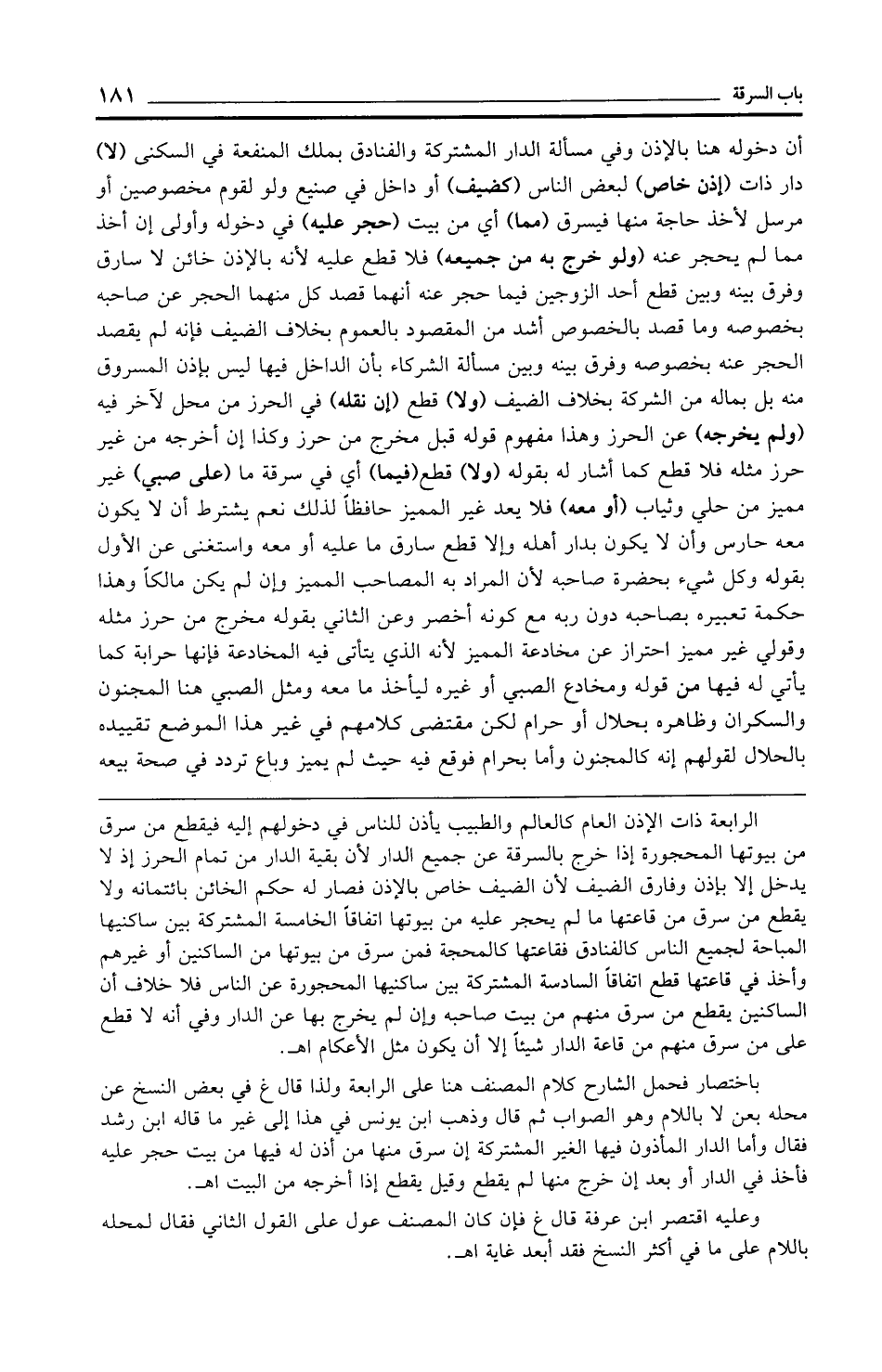 الرابعة ذات الإذن العام كالعالم والطبيب يأذن للناس في دخولهم إليه فيقطع من سرق من بيوتها المحجورة إذا خرج بالسرقة عن جميع الدار لأن بقية الدار من تمام الحرز إذ لا يدخل إلا بإذن وفارق الضيف لأن الضيف خاص بالإذن فصار له حكم الخائن بائتمانه ولا يقطع من سرق من قاعتها ما لم يحجر عليه من بيوتها اتفاقًا الخامسة المشتركة بين ساكنيها المباحة لجميع الناس كالفنادق فقاعتها كالمحجة فمن سرق من بيوتها من الساكنين أو غيرهم وأخذ في قاعتها قطع اتفاقًا السادسة المشتركة بين ساكنيها المحجورة عن الناس فلا خلاف أن الساكنين يقطع من سرق منهم من بيت صاحبه وإن لم يخرج بها عن الدار وفي أنه لا قطع على من سرق منهم من قاعة الدار شيئًا إلا أن يكون مثل الأعكام اهـ.