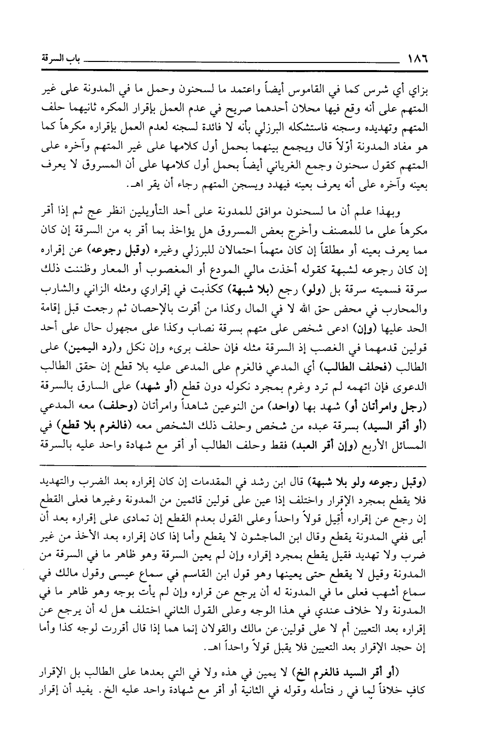 (وقبل رجوعه ولو بلا شبهة) قال ابن رشد في المقدمات إن كان إقراره بعد الضرب والتهديد فلا يقطع بمجرد الإقرار واختلف إذا عين على قولين قائمين من المدونة وغيرها فعلى القطع إن رجع عن إقراره أُقِيل قولًا واحدًا وعلى القول بعدم القطع إن تمادى على إقراره بعد أن أبى ففي المدونة يقطع وقال ابن الماجشون لا يقطع وأما إذا كان إقراره بعد الأخذ من غير ضرب ولا تهديد فقيل يقطع بمجرد إقراره وإن لم يعين السرقة وهو ظاهر ما في السرقة من المدونة وقيل لا يقطع حتى يعينها وهو قول ابن القاسم في سماع عيسى وقول مالك في سماع أشهب فعلى ما في المدونة له أن يرجع عن قراره وإن لم يأت بوجه وهو ظاهر ما في المدونة ولا خلاف عندي في هذا الوجه وعلى القول الثاني اختلف هل له أن يرجع عن إقراره بعد التعيين أم لا على قولين عن مالك والقولان إنما هما إذا قال أقررت لوجه كذا وأما إن جحد الإقرار بعد التعيين فلا يقبل قولًا واحدًا اهـ.
