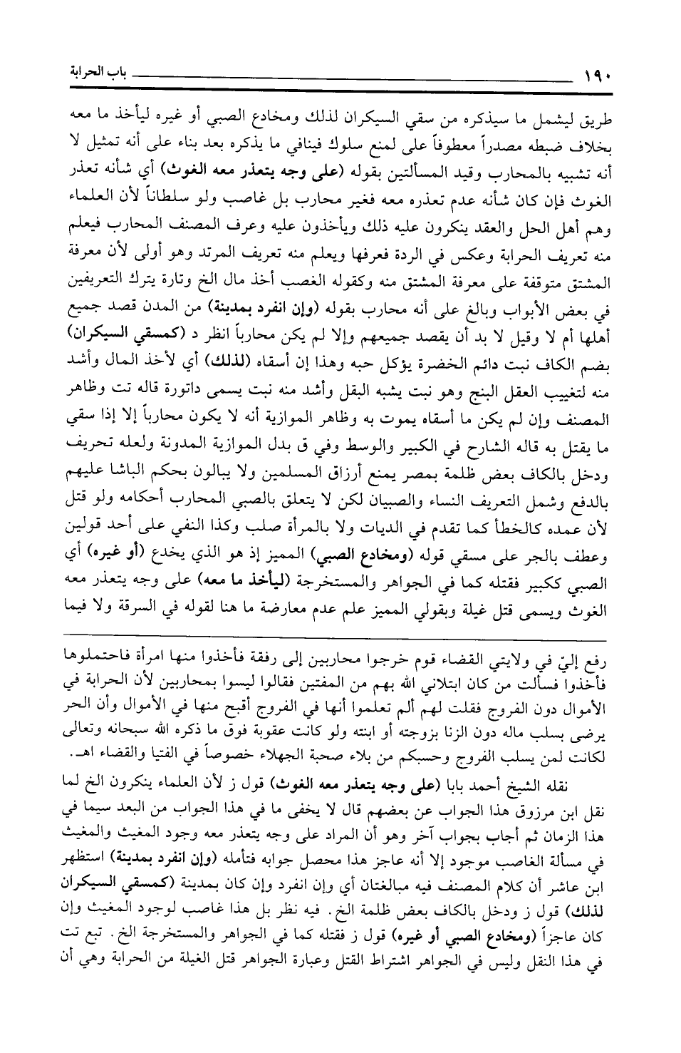 نقله الشيخ أحمد بابا (على وجه يتعذر معه الغوث) قول ز لأن العلماء ينكرون الخ لما نقل ابن مرزوق هذا الجواب عن بعضهم قال لا يخفى ما في هذا الجواب من البعد سيما في هذا الزمان ثم أجاب بجواب آخر وهو أن المراد على وجه يتعذر معه وجود المغيث والمغيث في مسألة الغاصب موجود إلا أنه عاجز هذا محصل جوابه فتأمله (وإن انفرد بمدينة) استظهر ابن عاشر أن كلام المصنف فيه مبالغتان أي وإن انفرد وإن كان بمدينة (كمسقي السيكران لذلك) قول ز ودخل بالكاف بعض ظلمة الخ. فيه نظر بل هذا غاصب لوجود المغيث وإن كان عاجزًا (ومخادع الصبي أو غيره) قول ز فقتله كما في الجواهر والمستخرجة الخ. تبع تت في هذا النقل وليس في الجواهر اشتراط القتل وعبارة الجواهر قتل الغيلة من الحرابة وهي أن