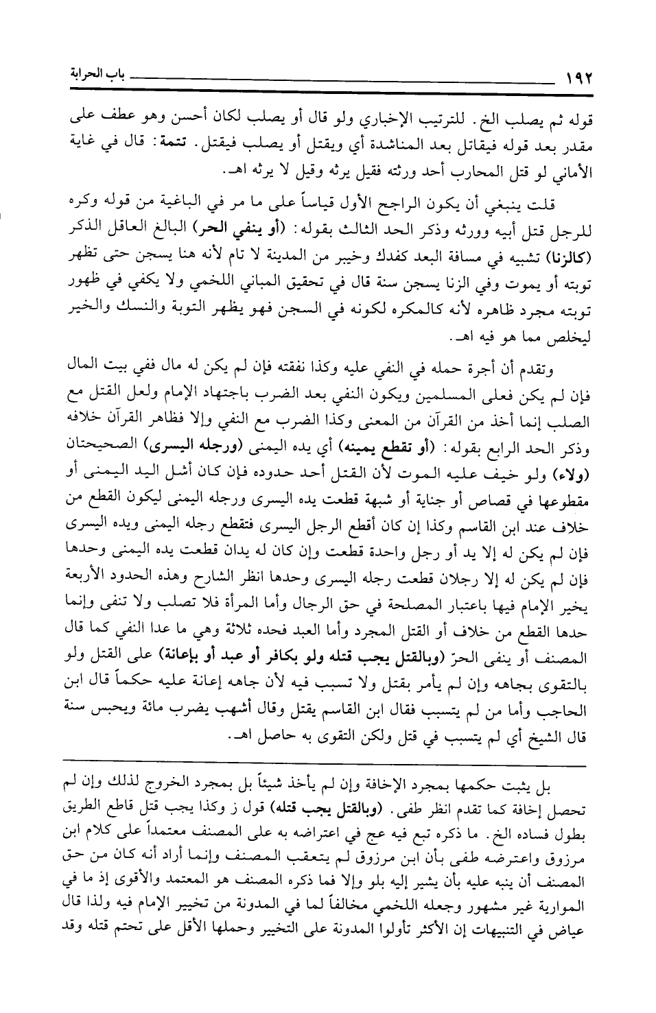 وتقدم أن أجرة حمله في النفي عليه وكذا نفقته فإن لم يكن له مال ففي بيت المال فإن لم يكن فعلى المسلمين ويكون النفي بعد الضرب باجتهاد الإمام ولعل القتل مع الصلب إنما أخذ من القرآن من المعنى وكذا الضرب مع النفي وإلا فظاهر القرآن خلافه وذكر الحد الرابع بقوله: (أو تقطع يمينه) أي يده اليمنى (ورجله اليسرى) الصحيحتان (ولاء) ولو خيف عليه الموت لأن القتل أحد حدوده فإن كان أشل اليد اليمنى أو مقطوعها في قصاص أو جناية أو شبهة قطعت يده اليسرى ورجله اليمنى ليكون القطع من خلاف عند ابن القاسم وكذا إن كان أقطع الرجل اليسرى فتقطع رجله اليمنى ويده اليسرى فإن لم يكن له إلا يد أو رجل واحدة قطعت وإن كان له يدان قطعت يده اليمنى وحدها فإن لم يكن له إلا رجلان قطعت رجله اليسرى وحدها انظر الشارح وهذه الحدود الأربعة يخير الإمام فيها باعتبار المصلحة في حق الرجال وأما المرأة فلا تصلب ولا تنفى وإنما حدها القطع من خلاف أو القتل المجرد وأما العبد فحده ثلاثة وهي ما عدا النفي كما قال المصنف أو ينفى الحرّ (وبالقتل يجب قتله ولو بكافر أو عبد أو بإعانة) على القتل ولو بالتقوى بجاهه وإن لم يأمر بقتل ولا تسبب فيه لأن جاهه إعانة عليه حكمًا قال ابن الحاجب وأما من لم يتسبب فقال ابن القاسم يقتل وقال أشهب يضرب مائة ويحبس سنة قال الشيخ أي لم يتسبب في قتل ولكن التقوى به حاصل اهـ.