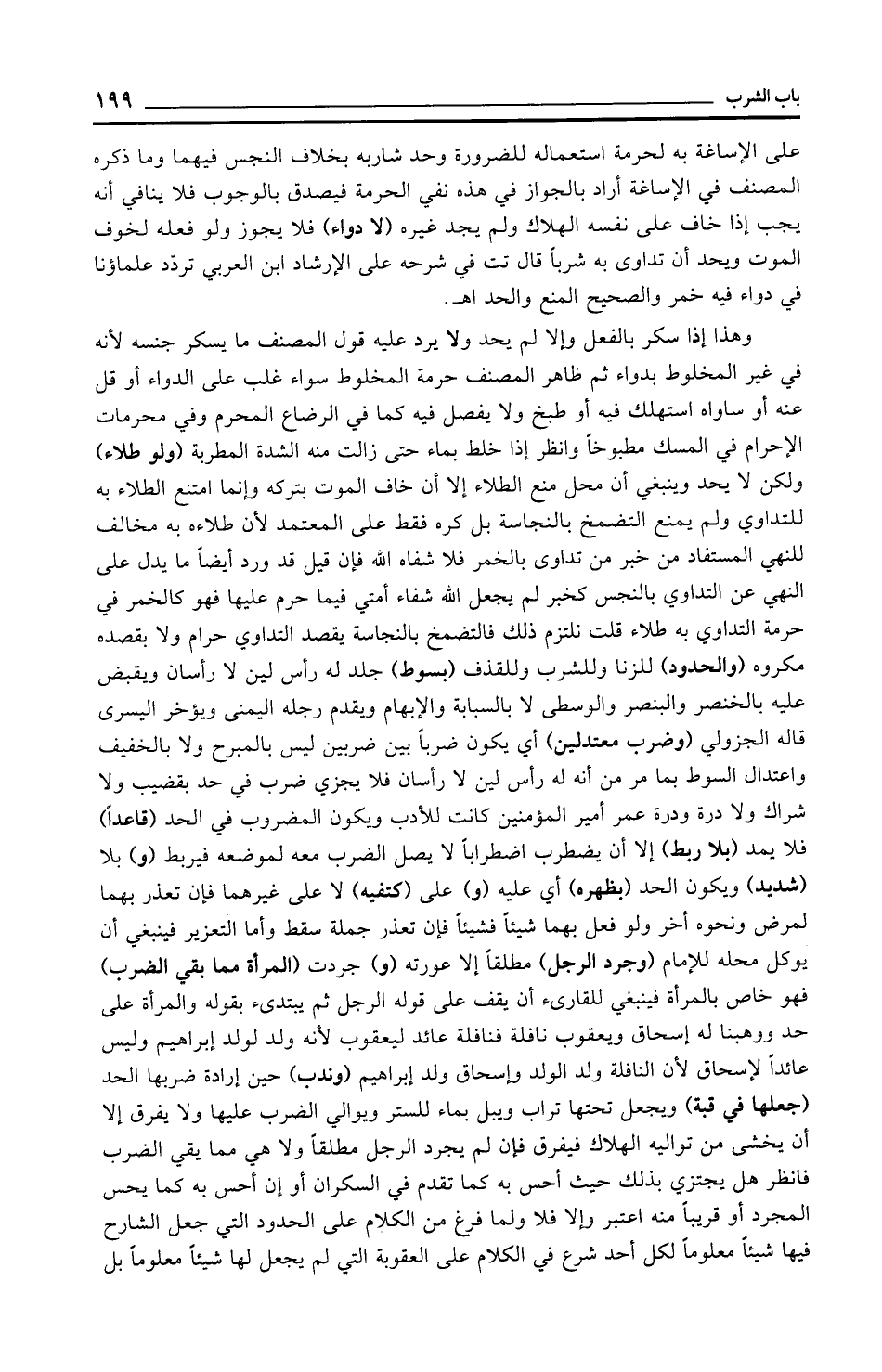 وهذا إذا سكر بالفعل وإلا لم يحد ولا يرد عليه قول المصنف ما يسكر جنسه لأنه في غير المخلوط بدواء ثم ظاهر المصنف حرمة المخلوط سواء غلب على الدواء أو قل عنه أو ساواه استهلك فيه أو طبخ ولا يفصل فيه كما في الرضاع المحرم وفي محرمات الإحرام في المسك مطبوخًا وانظر إذا خلط بماء حتى زالت منه الشدة المطربة (ولو طلاء) ولكن لا يحد وينبغي أن محل منع الطلاء إلا أن خاف الموت بتركه وإنما امتنع الطلاء به للتداوي ولم يمنع التضمخ بالنجاسة بل كره فقط على المعتمد لأن طلاءه به مخالف للنهي المستفاد من خبر من تداوى بالخمر فلا شفاه الله فإن قيل قد ورد أيضًا ما يدل على النهي عن التداوي بالنجس كخبر لم يجعل الله شفاء أمتي فيما حرم عليها فهو كالخمر في حرمة التداوي به طلاء قلت نلتزم ذلك فالتضمخ بالنجاسة يقصد التداوي حرام ولا بقصده مكروه (والحدود) للزنا وللشرب وللقذف (بسوط) جلد له رأس لين لا رأسان ويقبض عليه بالخنصر والبنصر والوسطى لا بالسبابة والإبهام ويقدم رجله اليمنى ويؤخر اليسرى قاله الجزولي (وضرب معتدلين) أي يكون ضربًا بين ضربين ليس بالمبرح ولا بالخفيف واعتدال السوط بما مر من أنه له رأس لين لا رأسان فلا يجزي ضرب في حد بقضيب ولا شراك ولا درة ودرة عمر أمير المؤمنين كانت للأدب ويكون المضروب في الحد (قاعدًا) فلا يمد (بلا ربط) إلا أن يضطرب اضطرابًا لا يصل الضرب معه لموضعه فيربط (و) بلا (شديد) ويكون الحد (بظهره) أي عليه (و) على (كتفيه) لا على غيرهما فإن تعذر بهما لمرض ونحوه أخر ولو فعل بهما شيئًا فشيئًا فإن تعذر جملة سقط وأما التعزير فينبغي أن يوكل محله للإمام (وجرد الرجل) مطلقًا إلا عورته (و) جردت (المرأة مما بقي الضرب) فهو خاص بالمرأة فينبغي للقارئ أن يقف على قوله الرجل ثم يبتدئ بقوله والمرأة على حد ووهبنا له إسحاق ويعقوب نافلة فنافلة عائد ليعقوب لأنه ولد لولد إبراهيم وليس عائدًا لإسحاق لأن النافلة ولد الولد وإسحاق ولد إبراهيم (وندب) حين إرادة ضربها الحد (جعلها في قبة) ويجعل تحتها تراب ويبل بماء للستر ويوالي الضرب عليها ولا يفرق إلا أن يخشى من تواليه الهلاك فيفرق فإن لم يجرد الرجل مطلقًا ولا هي مما يقي الضرب فانظر هل يجتزي بذلك حيث أحس به كما تقدم في السكران أو إن أحس به كما يحس المجرد أو قريبًا منه اعتبر وإلا فلا ولما فرغ من الكلام على الحدود التي جعل الشارح فيها شيئًا معلومًا لكل أحد شرع في الكلام على العقوبة التي لم يجعل لها شيئًا معلومًا بل
