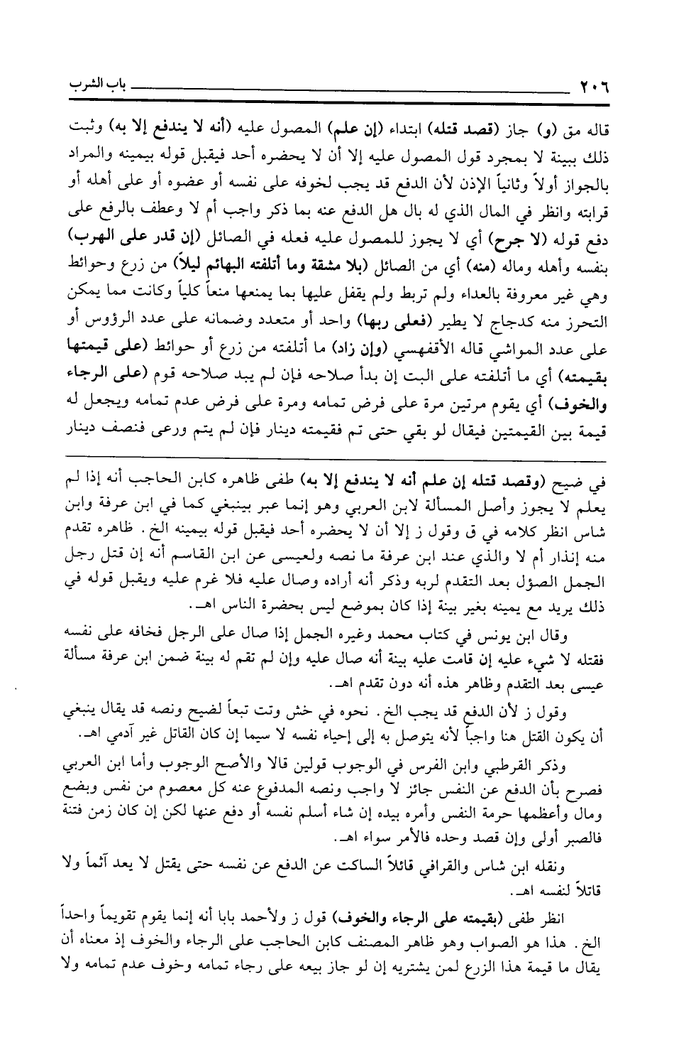 في ضيح (وقصد قتله إن علم أنه لا يندفع إلا به) طفى ظاهره كابن الحاجب أنه إذا لم يعلم لا يجوز وأصل المسألة لابن العربي وهو إنما عبر بينبغي كما في ابن عرفة وابن شاس انظر كلامه في ق وقول ز إلا أن لا يحضره أحد فيقبل قوله بيمينه الخ. ظاهره تقدم منه إنذار أم لا والذي عند ابن عرفة ما نصه ولعيسى عن ابن القاسم أنه إن قتل رجل الجمل الصؤل بعد التقدم لربه وذكر أنه أراده وصال عليه فلا غرم عليه ويقبل قوله في ذلك يريد مع يمينه بغير بينة إذا كان بموضع ليس بحضرة الناس اهـ.