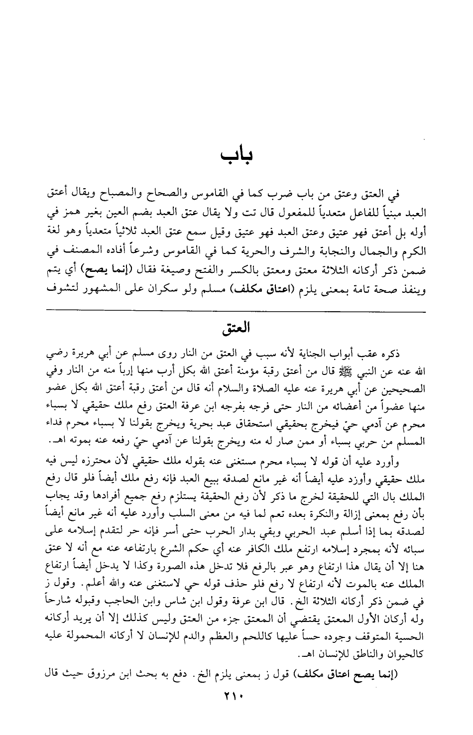 ذكره عقب أبواب الجناية لأنه سبب في العتق من النار روى مسلم عن أبي هريرة رضي الله عنه عن النبي - صلى الله عليه وسلم - قال من أعتق رقبة مؤمنة أعتق الله بكل أرب منها إربًا منه من النار وفي الصحيحين عن أبي هريرة عنه عليه الصلاة والسلام أنه قال من أعتق رقبة أعتق الله بكل عضو منها عضوًا من أعضائه من النار حتى فرجه بفرجه ابن عرفة العتق رفع ملك حقيقي لا بسباء محرم عن آدمي حيّ فيخرج بحقيقي استحقاق عبد بحرية ويخرج بقولنا لا بسباء محرم فداء المسلم من حربي بسباء أو ممن صار له منه ويخرج بقولنا عن آدمي حيّ رفعه عنه بموته اهـ.