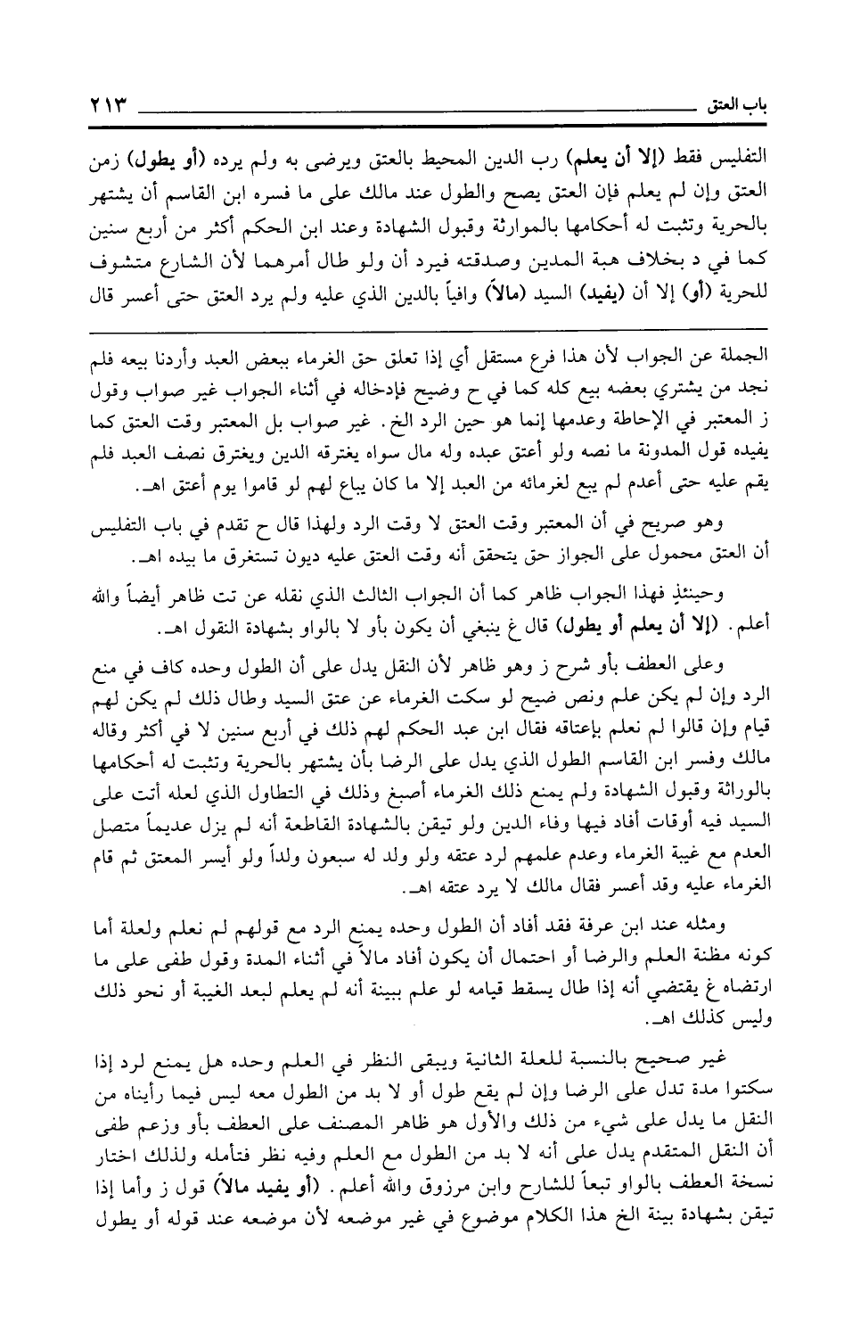 التفليس فقط (إلا أن يعلم) رب الدين المحيط بالعتق ويرضى به ولم يرده (أو يطول) زمن العتق وإن لم يعلم فإن العتق يصح والطول عند مالك على ما فسره ابن القاسم أن يشتهر بالحرية وتثبت له أحكامها بالموارثة وقبول الشهادة وعند ابن الحكم أكثر من أربع سنين كما في د بخلاف هبة المدين وصدقته فيرد أن ولو طال أمرهما لأن الشارع متشوف للحرية (أو) إلا أن (يفيد) السيد (مالًا) وافيًا بالدين الذي عليه ولم يرد العتق حتى أعسر قال