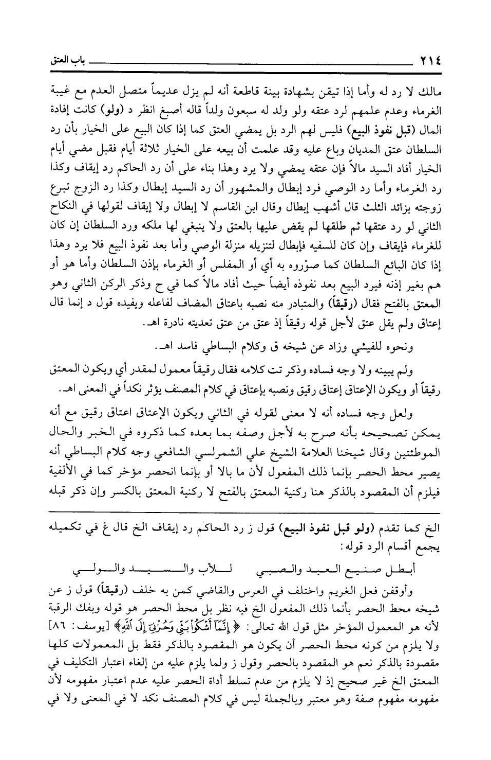 مالك لا رد له وأما إذا تيقن بشهادة بينة قاطعة أنه لم يزل عديمًا متصل العدم مع غيبة الغرماء وعدم علمهم لرد عتقه ولو ولد له سبعون ولدًا قاله أصبغ انظر د (ولو) كانت إفادة المال (قبل نفوذ البيع) فليس لهم الرد بل يمضي العتق كما إذا كان البيع على الخيار بأن رد السلطان عتق المديان وباع عليه وقد علمت أن بيعه على الخيار ثلاثة أيام فقبل مضي أيام الخيار أفاد السيد مالًا فإن عتقه يمضي ولا يرد وهذا بناء على أن رد الحاكم رد إيقاف وكذا رد الغرماء وأما رد الوصي فرد إبطال والمشهور أن رد السيد إبطال وكذا رد الزوج تبرع زوجته بزائد الثلث قال أشهب إبطال وقال ابن القاسم لا إبطال ولا إيقاف لقولها في النكاح الثاني لو رد عتقها ثم طلقها لم يقض عليها بالعتق ولا ينبغي لها ملكه ورد السلطان إن كان للغرماء فإيقاف وإن كان للسفيه فإبطال لتنزيله منزلة الوصي وأما بعد نفوذ البيع فلا يرد وهذا إذا كان البائع السلطان كما صوّروه به أي أو المفلس أو الغرماء بإذن السلطان وأما هو أو هم بغير إذنه فيرد البيع بعد نفوذه أيضًا حيث أفاد مالًا كما في ح وذكر الركن الثاني وهو المعتق بالفتح فقال (رقيقًا) والمتبادر منه نصبه بإعتاق المضاف لفاعله ويفيده قول د إنما قال إعتاق ولم يقل عتق لأجل قوله رقيقًا إذ عتق من عتق تعديته نادرة اهـ.