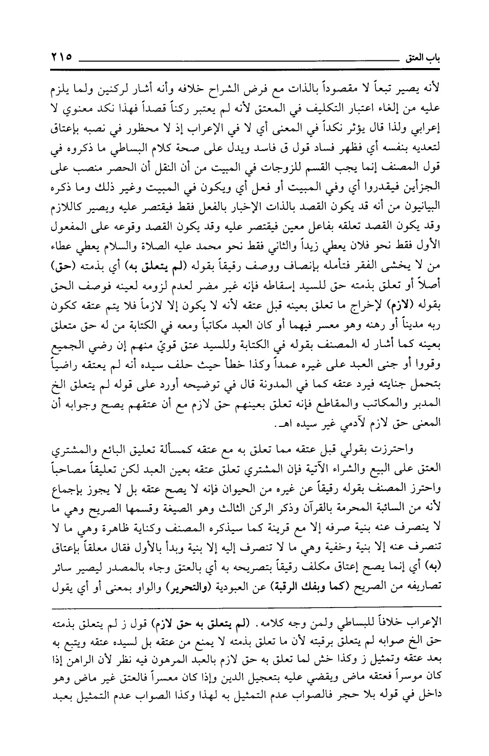 الإعراب خلافًا للبساطي ولمن وجه كلامه. (لم يتعلق به حق لازم) قول ز لم يتعلق بذمته حق الخ صوابه لم يتعلق برقبته لأن ما تعلق بذمته لا يمنع من عتقه بل لسيده عتقه ويتبع به بعد عتقه وتمثيل ز وكذا خش لما تعلق به حق لازم بالعبد المرهون فيه نظر لأن الراهن إذا كان موسرًا فعتقه ماض ويقضي عليه بتعجيل الدين وإذا كان معسرًا فالعتق غير ماض وهو داخل في قوله بلا حجر فالصواب عدم التمثيل به لهذا وكذا الصواب عدم التمثيل بعبد