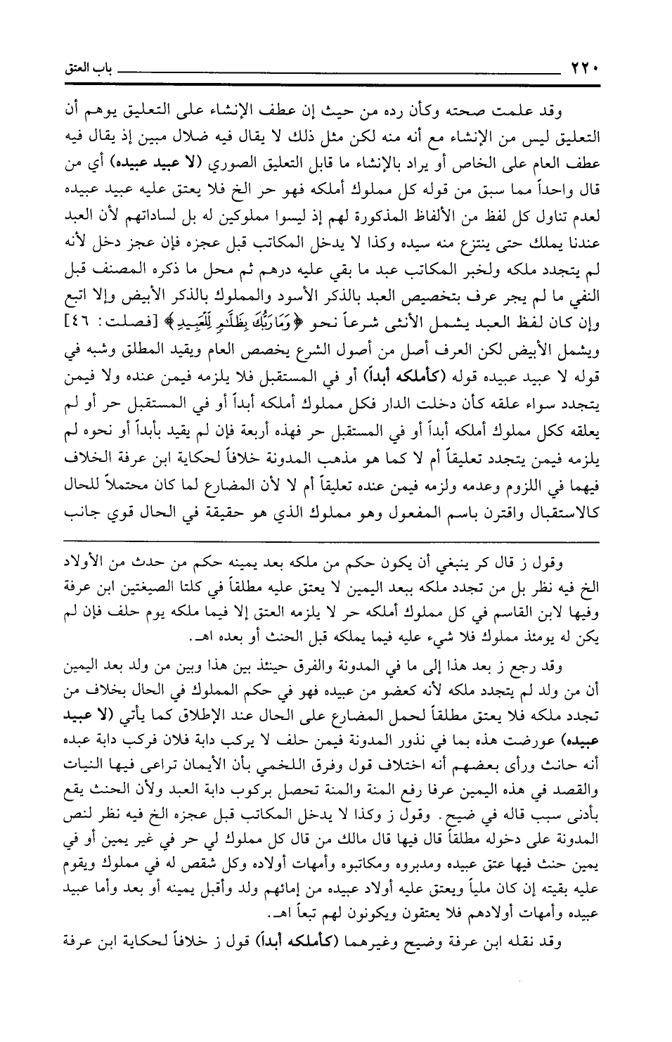 وقد علمت صحته وكأن رده من حيث إن عطف الإنشاء على التعليق يوهم أن التعليق ليس من الإنشاء مع أنه منه لكن مثل ذلك لا يقال فيه ضلال مبين إذ يقال فيه عطف العام على الخاص أو يراد بالإنشاء ما قابل التعليق الصوري (لا عبيد عبيده) أي من قال واحدًا مما سبق من قوله كل مملوك أملكه فهو حر الخ فلا يعتق عليه عبيد عبيده لعدم تناول كل لفظ من الألفاظ المذكورة لهم إذ ليسوا مملوكين له بل لساداتهم لأن العبد عندنا يملك حتى ينتزع منه سيده وكذا لا يدخل المكاتب قبل عجزه فإن عجز دخل لأنه لم يتجدد ملكه ولخبر المكاتب عبد ما بقي عليه درهم ثم محل ما ذكره المصنف قبل النفي ما لم يجر عرف بتخصيص العبد بالذكر الأسود والمملوك بالذكر الأبيض وإلا اتبع وإن كان لفظ العبد يشمل الأنثى شرعًا نحو {وَمَا رَبُّكَ بِظَلَّامٍ لِلْعَبِيدِ} [فصلت: 46] ويشمل الأبيض لكن العرف أصل من أصول الشرع يخصص العام ويقيد المطلق وشبه في قوله لا عبيد عبيده قوله (كأملكه أبدًا) أو في المستقبل فلا يلزمه فيمن عنده ولا فيمن يتجدد سواء علقه كأن دخلت الدار فكل مملوك أملكه أبدًا أو في المستقبل حر أو لم يعلقه ككل مملوك أملكه أبدًا أو في المستقبل حر فهذه أربعة فإن لم يقيد بأبدًا أو نحوه لم يلزمه فيمن يتجدد تعليقًا أم لا كما هو مذهب المدونة خلافًا لحكاية ابن عرفة الخلاف فيهما في اللزوم وعدمه ولزمه فيمن عنده تعليقًا أم لا لأن المضارع لما كان محتملًا للحال كالاستقبال واقترن باسم المفعول وهو مملوك الذي هو حقيقة في الحال قوي جانب