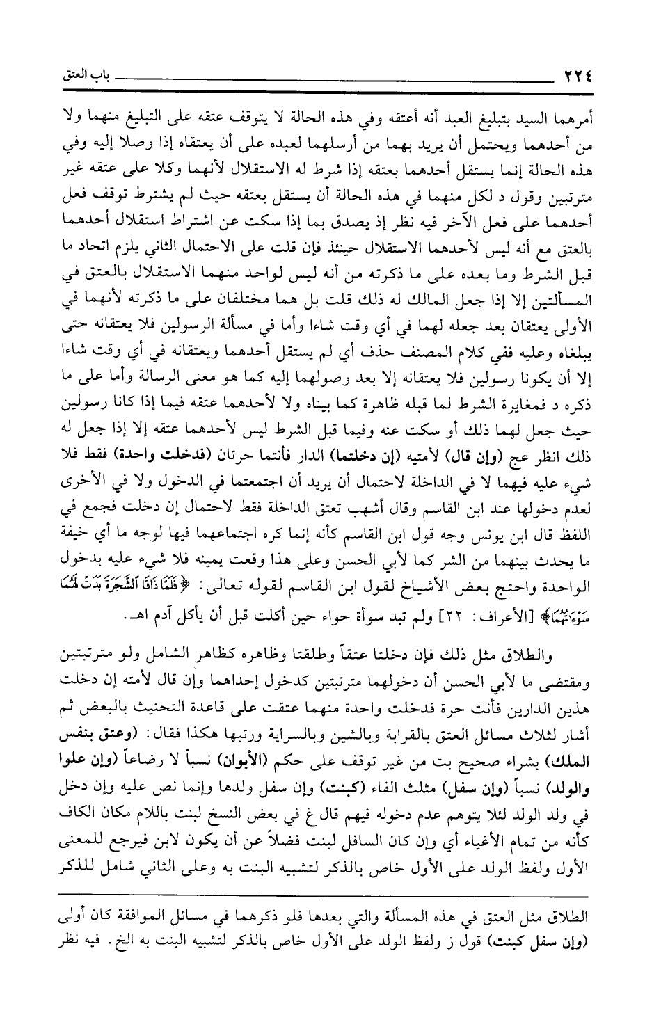 أمرهما السيد بتبليغ العبد أنه أعتقه وفي هذه الحالة لا يتوقف عتقه على التبليغ منهما ولا من أحدهما ويحتمل أن يريد بهما من أرسلهما لعبده على أن يعتقاه إذا وصلا إليه وفي هذه الحالة إنما يستقل أحدهما بعتقه إذا شرط له الاستقلال لأنهما وكلا على عتقه غير مترتبين وقول د لكل منهما في هذه الحالة أن يستقل بعتقه حيث لم يشترط توقف فعل أحدهما على فعل الآخر فيه نظر إذ يصدق بما إذا سكت عن اشتراط استقلال أحدهما بالعتق مع أنه ليس لأحدهما الاستقلال حينئذ فإن قلت على الاحتمال الثاني يلزم اتحاد ما قبل الشرط وما بعده على ما ذكرته من أنه ليس لواحد منهما الاستقلال بالعتق في المسألتين إلا إذا جعل المالك له ذلك قلت بل هما مختلفان على ما ذكرته لأنهما في الأولى يعتقان بعد جعله لهما في أي وقت شاءا وأما في مسألة الرسولين فلا يعتقانه حتى يبلغاه وعليه ففي كلام المصنف حذف أي لم يستقل أحدهما ويعتقانه في أي وقت شاءا إلا أن يكونا رسولين فلا يعتقانه إلا بعد وصولهما إليه كما هو معنى الرسالة وأما على ما ذكره د فمغايرة الشرط لما قبله ظاهرة كما بيناه ولا لأحدهما عتقه فيما إذا كانا رسولين حيث جعل لهما ذلك أو سكت عنه وفيما قبل الشرط ليس لأحدهما عتقه إلا إذا جعل له ذلك انظر عج (وإن قال) لأمتيه (إن دخلتما) الدار فأنتما حرتان (فدخلت واحدة) فقط فلا شيء عليه فيهما لا في الداخلة لاحتمال أن يريد أن اجتمعتما في الدخول ولا في الأخرى لعدم دخولها عند ابن القاسم وقال أشهب تعتق الداخلة فقط لاحتمال إن دخلت فجمع في اللفظ قال ابن يونس وجه قول ابن القاسم كأنه إنما كره اجتماعهما فيها لوجه ما أي خيفة ما يحدث بينهما من الشر كما لأبي الحسن وعلى هذا وقعت يمينه فلا شيء عليه بدخول الواحدة واحتج بعض الأشياخ لقول ابن القاسم لقوله تعالى: {فَلَمَّا ذَاقَا الشَّجَرَةَ بَدَتْ لَهُمَا سَوْآتُهُمَا} [الأعراف: 22] ولم تبد سوأة حواء حين أكلت قبل أن يأكل آدم اهـ.