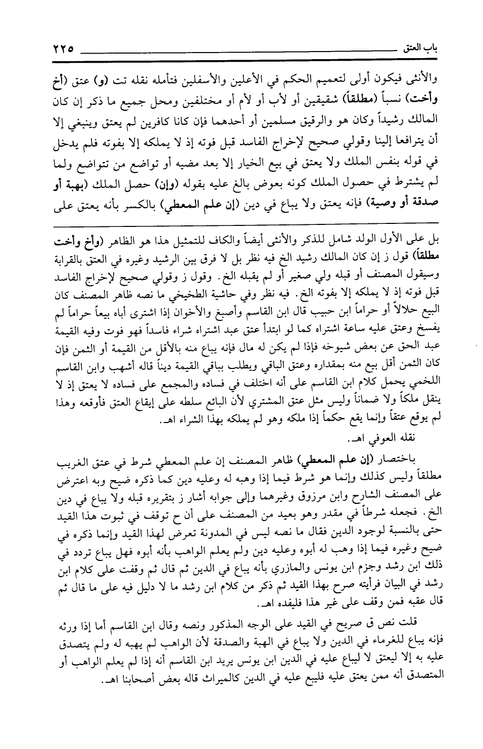 باختصار (إن علم المعطي) ظاهر المصنف إن علم المعطي شرط في عتق الغريب مطلقًا وليس كذلك وإنما هو شرط فيما إذا وهبه له وعليه دين كما ذكره ضيح وبه اعترض على المصنف الشارح وابن مرزوق وغيرهما وإلى جوابه أشار ز بتقريره قبله ولا يباع في دين الخ. فجعله شرطًا في مقدر وهو بعيد من المصنف على أن ح توقف في ثبوت هذا القيد حتى بالنسبة لوجود الدين فقال ما نصه ليس في المدونة تعرض لهذا القيد وإنما ذكره في ضيح وغيره فيما إذا وهب له أبوه وعليه دين ولم يعلم الواهب بأنه أبوه فهل يباع تردد في ذلك ابن رشد وجزم ابن يونس والمازري بأنه يباع في الدين ثم قال ثم وقفت على كلام ابن رشد في البيان فرأيته صرح بهذا القيد ثم ذكر من كلام ابن رشد ما لا دليل فيه على ما قال ثم قال عقبه فمن وقف على غير هذا فليفده اهـ.