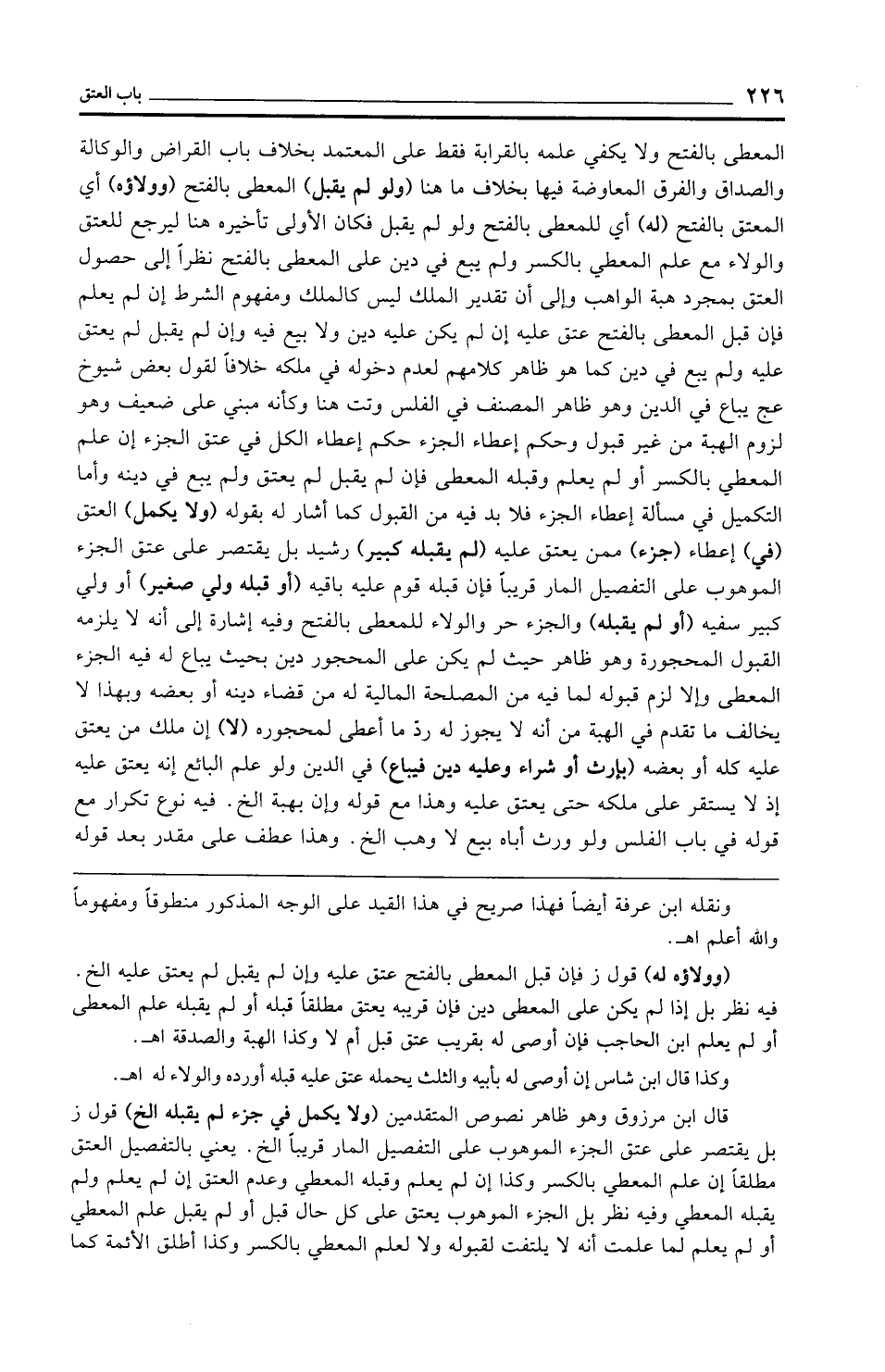 المعطى بالفتح ولا يكفي علمه بالقرابة فقط على المعتمد بخلاف باب القراض والوكالة والصداق والفرق المعاوضة فيها بخلاف ما هنا (ولو لم يقبل) المعطى بالفتح (وولاؤه) أي المعتق بالفتح (له) أي للمعطى بالفتح ولو لم يقبل فكان الأولى تأخيره هنا ليرجع للعتق والولاء مع علم المعطي بالكسر ولم يبع في دين على المعطى بالفتح نظرًا إلى حصول العتق بمجرد هبة الواهب وإلى أن تقدير الملك ليس كالملك ومفهوم الشرط إن لم يعلم فإن قبل المعطى بالفتح عتق عليه إن لم يكن عليه دين ولا بيع فيه وإن لم يقبل لم يعتق عليه ولم يبع في دين كما هو ظاهر كلامهم لعدم دخوله في ملكه خلافًا لقول بعض شيوخ عج يباع في الدين وهو ظاهر المصنف في الفلس وتت هنا وكأنه مبني على ضعيف وهو لزوم الهبة من غير قبول وحكم إعطاء الجزء حكم إعطاء الكل في عتق الجزء إن علم المعطي بالكسر أو لم يعلم وقبله المعطى فإن لم يقبل لم يعتق ولم يبع في دينه وأما التكميل في مسألة إعطاء الجزء فلا بد فيه من القبول كما أشار له بقوله (ولا يكمل) العتق (في) إعطاء (جزء) ممن يعتق عليه (لم يقبله كبير) رشيد بل يقتصر على عتق الجزء الموهوب على التفصيل المار قريبًا فإن قبله قوم عليه باقيه (أو قبله ولي صغير) أو ولي كبير سفيه (أو لم يقبله) والجزء حر والولاء للمعطى بالفتح وفيه إشارة إلى أنه لا يلزمه القبول المحجورة وهو ظاهر حيث لم يكن على المحجور دين بحيث يباع له فيه الجزء المعطى وإلا لزم قبوله لما فيه من المصلحة المالية له من قضاء دينه أو بعضه وبهذا لا يخالف ما تقدم في الهبة من أنه لا يجوز له ردّ ما أعطى لمحجوره (لا) إن ملك من يعتق عليه كله أو بعضه (بإرث أو شراء وعليه دين فيباع) في الدين ولو علم البائع إنه يعتق عليه إذ لا يستقر على ملكه حتى يعتق عليه وهذا مع قوله وإن بهبة الخ. فيه نوع تكرار مع قوله في باب الفلس ولو ورث أباه بيع لا وهب الخ. وهذا عطف على مقدر بعد قوله