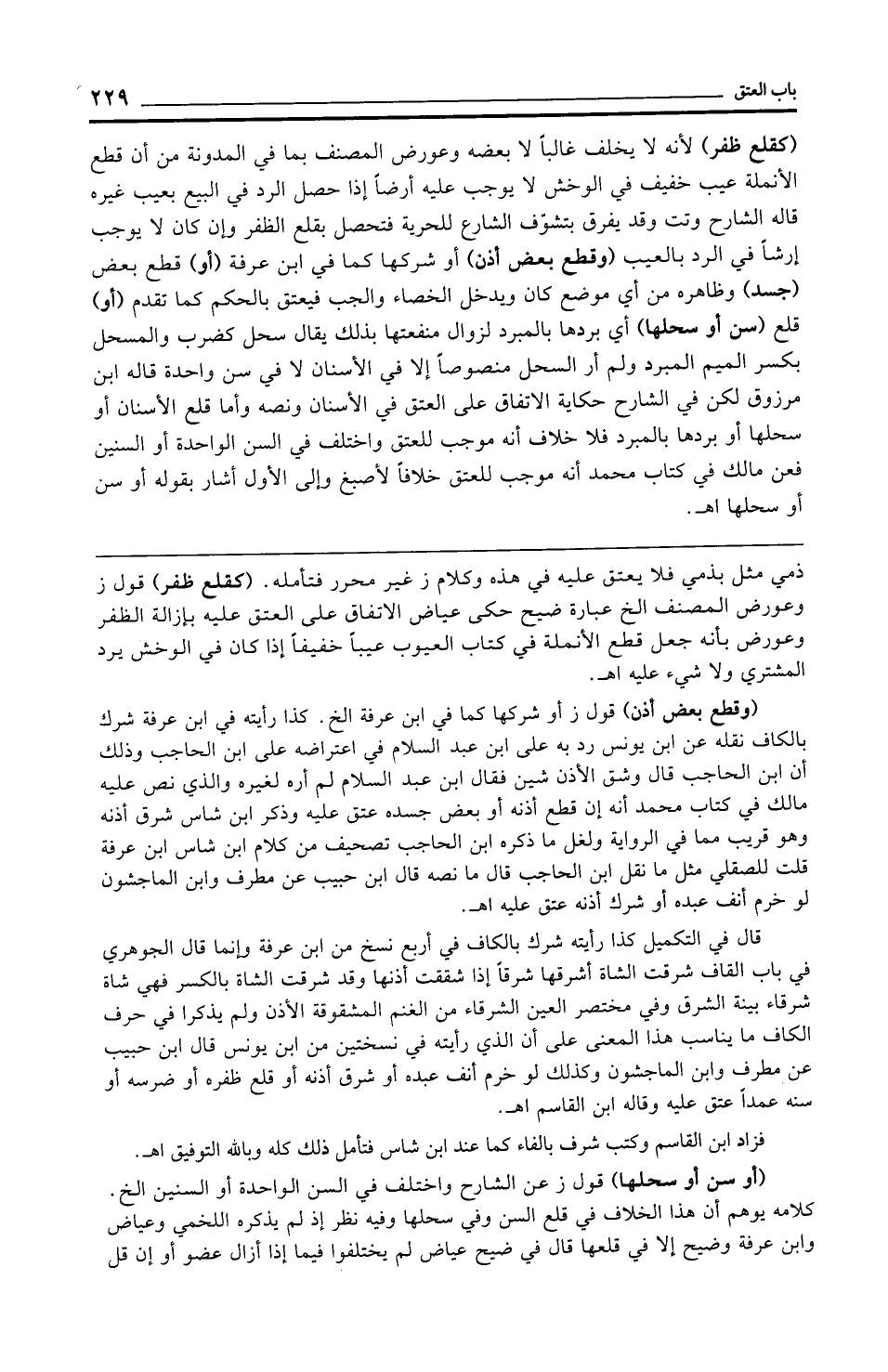 (وقطع بعض أذن) قول ز أو شركها كما في ابن عرفة الخ. كذا رأيته في ابن عرفة شرك بالكاف نقله عن ابن يونس رد به على ابن عبد السلام في اعتراضه على ابن الحاجب وذلك أن ابن الحاجب قال وشق الأذن شين فقال ابن عبد السلام لم أره لغيره والذي نص عليه مالك في كتاب محمد أنه إن قطع أذنه أو بعض جسده عتق عليه وذكر ابن شاس شرق أذنه وهو قريب مما في الرواية ولعل ما ذكره ابن الحاجب تصحيف من كلام ابن شاس ابن عرفة قلت للصقلي مثل ما نقل ابن الحاجب قال ما نصه قال ابن حبيب عن مطرف وابن الماجشون لو خرم أنف عبده أو شرك أذنه عتق عليه اهـ.