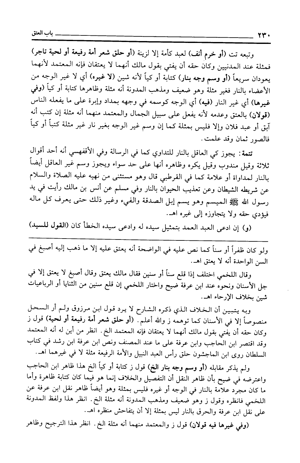 وتبعه تت (أو خرم أنف) لعبد كأمة إلا لزينة (أو حلق شعر أمة رفيعة أو لحية تاجر) فمثلة عند المدنيين وكان حقه أن يفتي بقول مالك أنهما لا يعتقان فإنه المعتمد لأنهما يعودان سريعًا (أو وسم وجه بنار) كتابة أو كيًّا لأنه شين (لا غيره) أي لا غير الوجه من الأعضاء بالنار فغير مثلة وهو ضعيف ومذهب المدونة أنه مثلة وظاهرها كتابة أو كيًّا (وفي غيرها) أي غير النار (فيه) أي الوجه كوسمه في وجهه بمداد وإبرة على ما يفعله الناس (قولان) بالعتق وعدمه لأنه يفعل على سبيل الجمال والمعتمد منهما أنه مثلة إن كتب أنه آبق أو عبد فلان وإلا فليس بمثلة كما إن وسم غير الوجه بغير نار غير مثلة كتبًا أو كيًّا فالصور ثمان وقد علمت.