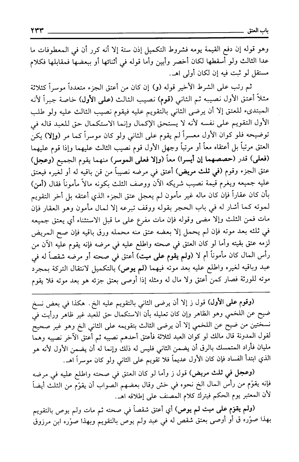 (وقوم على الأول) قول ز إلا أن يرضى الثاني بالتقويم عليه الخ. هكذا في بعض نسخ ضيح عن اللخمي وهو الظاهر وإن كان تعليله بأن الاستكمال حق للعبد غير ظاهر ورأيت في نسختين من ضيح عن اللخمي إلا أن يرضى الثالث بتقويمه على الثاني الخ وهو غير صحيح لقول المدونة قال مالك لو كان العبد لثلاثة فاعتق أحدهم نصيبه ثم أعتق الآخر نصيبه وهما مليان فأراد المتمسك بالرق أن يضمن الثاني فليس له ذلك وإنما له أن يضمن الأول لأنه هو الذي ابتدأ الفساد فإن كان الأول عديمًا فلا تقويم على الثاني ولو كان موسرًا اهـ.