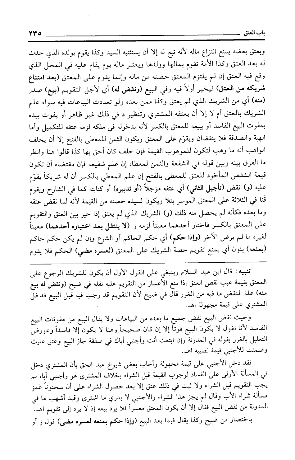 تنبيه: قال ابن عبد السلام وينبغي على القول الأول أن يكون للشريك الرجوع على المعتق بقيمة عيب نقص العتق إذا منع الأعسار من التقويم عليه نقله في ضيح (ونقض له بيع منه) علة النقض ما فيه من الغرر قال في ضيح لأن التقويم قد وجب فيه قبل البيع فدخل المشتري على قيمة مجهولة اهـ.