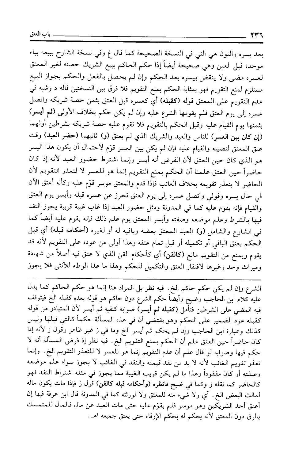 الشرع وإن لم يكن حكم حاكم الخ. فيه نظر بل المراد هنا إنما هو حكم الحاكم كما يدل عليه كلام ابن الحاجب وضيح وأيضًا حكم الشرع دون حاكم هو قوله بعده كقبله الخ فيتوقف فيه المضي على الشرطين فتأمل (كقبله ثم أيسر) صوابه كنفيه ثم أيسر لأن المتبادر من قوله كقبله عود الضمير على الحكم وهو يقتضي أن في هذه المسألة حكمًا كالتي قبلها وليس كذلك وعبارة ابن الحاجب وإن لم يحكم ثم أيسر الخ وما في ز غير ظاهر وقول ز لأنه إذا كان حاضرًا حين العتق علم أن الحكم بمنع التقويم الخ. فيه نظر إذ فرض المسألة أنه لا حكم فيها وصوابه لو قال علم أن عدم التقويم إنما هو للعسر لا للتعذر التقويم الخ. وإنما تعذر تقويم الغائب لأنه لا بد من نقد قيمته والنقد في الغائب لا يجوز سواء علم موضعه وصفته أو كان مفقودًا وهذا ما لم يكن قريب الغيبة مما يجوز في مثله اشتراط النقد فهو كالحاضر كما نقله ز وكما في ضيح فانظره (وأحكامه قبله كالقن) قول ز فإذا مات يكون ماله لمالك البعض الخ. أي ولا شيء منه للمعتق ولا لورثته كما في المدونة قال ابن عرفة فيها إن أعتق أحد الشريكين وهو موسر فلم يقوّم عليه حتى مات العبد عن مال فالمال للمتمسك بالرق دون المعتق لأنه يحكم له بحكم الإرقاء حتى يعتق جميعه اهـ.