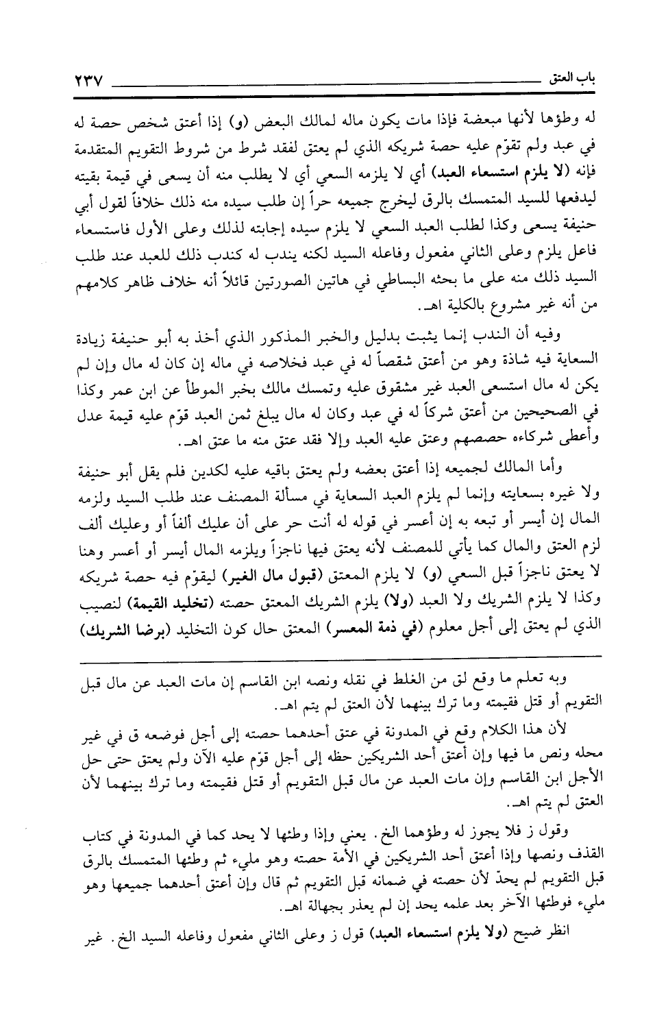 له وطؤها لأنها مبعضة فإذا مات يكون ماله لمالك البعض (و) إذا أعتق شخص حصة له في عبد ولم تقوّم عليه حصة شريكه الذي لم يعتق لفقد شرط من شروط التقويم المتقدمة فإنه (لا يلزم استسعاء العبد) أي لا يلزمه السعي أي لا يطلب منه أن يسعى في قيمة بقيته ليدفعها للسيد المتمسك بالرق ليخرج جميعه حرًّا إن طلب سيده منه ذلك خلافًا لقول أبي حنيفة يسعى وكذا لطلب العبد السعي لا يلزم سيده إجابته لذلك وعلى الأول فاستسعاء فاعل يلزم وعلى الثاني مفعول وفاعله السيد لكنه يندب له كندب ذلك للعبد عند طلب السيد ذلك منه على ما بحثه البساطي في هاتين الصورتين قائلًا أنه خلاف ظاهر كلامهم من أنه غير مشروع بالكلية اهـ.