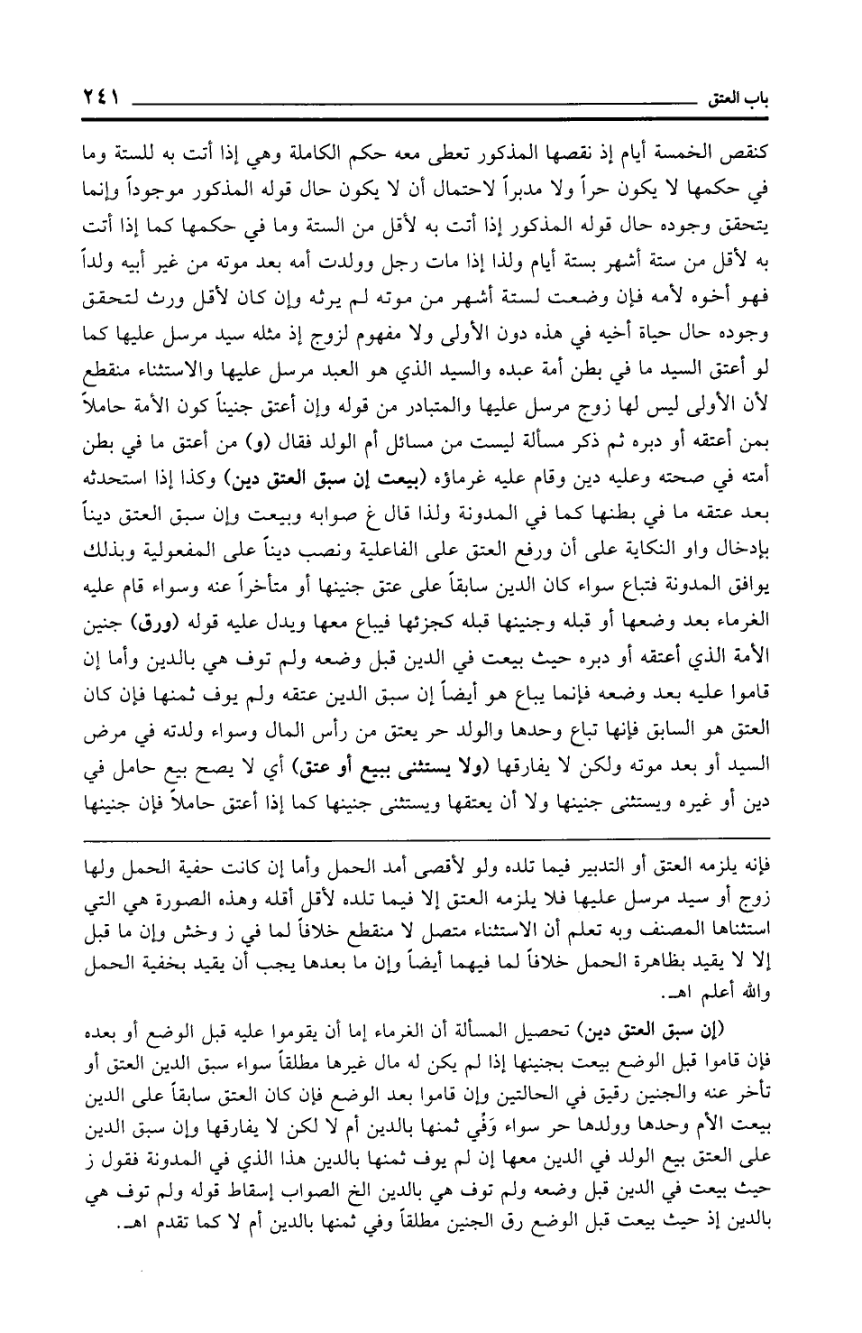 كنقص الخمسة أيام إذ نقصها المذكور تعطى معه حكم الكاملة وهي إذا أتت به للستة وما في حكمها لا يكون حرًّا ولا مدبرًا لاحتمال أن لا يكون حال قوله المذكور موجودًا وإنما يتحقق وجوده حال قوله المذكور إذا أتت به لأقل من الستة وما في حكمها كما إذا أتت به لأقل من ستة أشهر بستة أيام ولذا إذا مات رجل وولدت أمه بعد موته من غير أبيه ولدًا فهو أخوه لأمه فإن وضعت لستة أشهر من موته لم يرثه وإن كان لأقل ورث لتحقق وجوده حال حياة أخيه في هذه دون الأولى ولا مفهوم لزوج إذ مثله سيد مرسل عليها كما لو أعتق السيد ما في بطن أمة عبده والسيد الذي هو العبد مرسل عليها والاستثناء منقطع لأن الأولى ليس لها زوج مرسل عليها والمتبادر من قوله وإن أعتق جنينًا كون الأمة حاملًا بمن أعتقه أو دبره ثم ذكر مسألة ليست من مسائل أم الولد فقال (و) من أعتق ما في بطن أمته في صحته وعليه دين وقام عليه غرماؤه (بيعت إن سبق العتق دين) وكذا إذا استحدثه بعد عتقه ما في بطنها كما في المدونة ولذا قال غ صوابه وبيعت وإن سبق العتق دينًا بإدخال واو النكاية على أن ورفع العتق على الفاعلية ونصب دينًا على المفعولية وبذلك يوافق المدونة فتباع سواء كان الدين سابقًا على عتق جنينها أو متأخرًا عنه وسواء قام عليه الغرماء بعد وضعها أو قبله وجنينها قبله كجزئها فيباع معها ويدل عليه قوله (ورق) جنين الأمة الذي أعتقه أو دبره حيث بيعت في الدين قبل وضعه ولم توف هي بالدين وأما إن قاموا عليه بعد وضعه فإنما يباع هو أيضًا إن سبق الدين عتقه ولم يوف ثمنها فإن كان العتق هو السابق فإنها تباع وحدها والولد حر يعتق من رأس المال وسواء ولدته في مرض السيد أو بعد موته ولكن لا يفارقها (ولا يستثنى ببيع أو عتق) أي لا يصح بيع حامل في دين أو غيره ويستثنى جنينها ولا أن يعتقها ويستثنى جنينها كما إذا أعتق حاملًا فإن جنينها