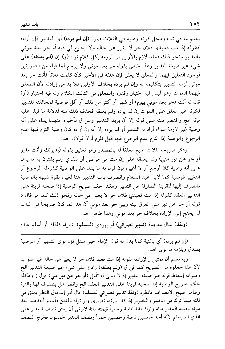 وبه تعلم أن تمثيل ز لإرادته بقوله إذا مت فعبد فلان حر لا يغير عن حاله غير صواب لأن هذا جعلوه من الصريح كما في ق (ولم يعلقه) زاد ز على شيء غير صيغة التدبير الخ وصوابه إسقاط قوله غير صيغة التدبير إذ لا معنى له تأمل (أو حر عن دبر مني) قول ز وهكذا حكم صريح الوصية إذا صحبه قرينة على التدبير انعقد الخ وانظر هل ينصرف لها بالنية وظاهر ضيح الانصراف فانظره (ونفذ تدبير نصراني لمسلم) قال أبو إسحاق النظر يعتق في ثلثه فيما ترك من الخمر والخنزير إذا كان ورثته نصارى ولو ترك ولدين فأسلم أحدهما بعد موته وقيمة المدبر مائة وترك مائة ناضة وخمرًا قيمته مائة لانبغى أن يعتق نصف المدبر على الذي لم يسلم لأنه أخذ خمسين ناضة وخمسين خمرًا ونصف المدبر خمسون فخرج النصف