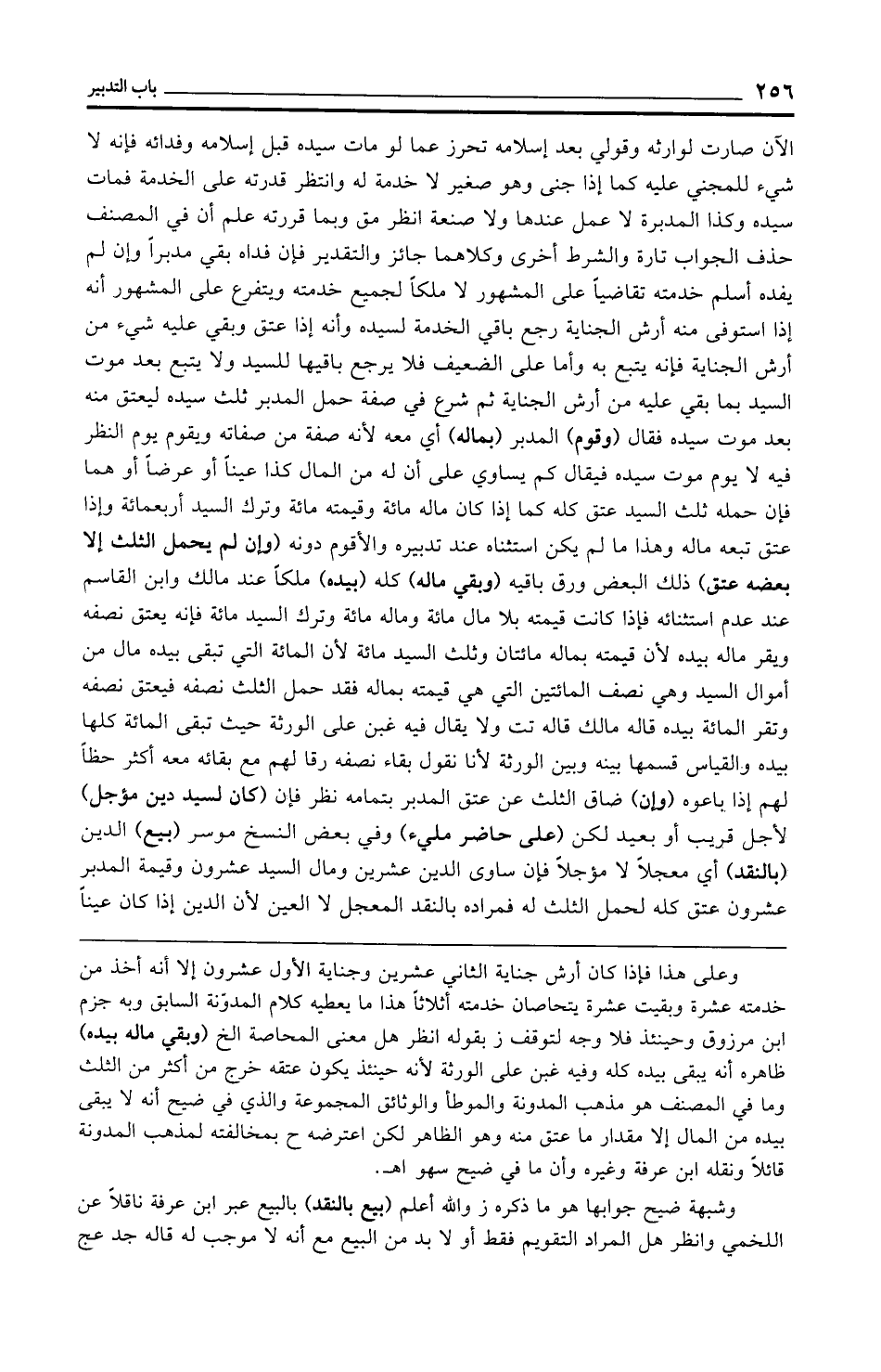 الآن صارت لوارثه وقولي بعد إسلامه تحرز عما لو مات سيده قبل إسلامه وفدائه فإنه لا شيء للمجني عليه كما إذا جنى وهو صغير لا خدمة له وانتظر قدرته على الخدمة فمات سيده وكذا المدبرة لا عمل عندها ولا صنعة انظر مق وبما قررته علم أن في المصنف حذف الجواب تارة والشرط أخرى وكلاهما جائز والتقدير فإن فداه بقي مدبرًا وإن لم يفده أسلم خدمته تقاضيًا على المشهور لا ملكًا لجميع خدمته ويتفرع على المشهور أنه إذا استوفى منه أرش الجناية رجع باقي الخدمة لسيده وأنه إذا عتق وبقي عليه شيء من أرش الجناية فإنه يتبع به وأما على الضعيف فلا يرجع باقيها للسيد ولا يتبع بعد موت السيد بما بقي عليه من أرش الجناية ثم شرع في صفة حمل المدبر ثلث سيده ليعتق منه بعد موت سيده فقال (وقوم) المدبر (بماله) أي معه لأنه صفة من صفاته ويقوم يوم النظر فيه لا يوم موت سيده فيقال كم يساوي على أن له من المال كذا عينًا أو عرضًا أو هما فإن حمله ثلث السيد عتق كله كما إذا كان ماله مائة وقيمته مائة وترك السيد أربعمائة وإذا عتق تبعه ماله وهذا ما لم يكن استثناه عند تدبيره والأقوم دونه (وإن لم يحمل الثلث إلا بعضه عتق) ذلك البعض ورق باقيه (وبقي ماله) كله (بيده) ملكًا عند مالك وابن القاسم عند عدم استثنائه فإذا كانت قيمته بلا مال مائة وماله مائة وترك السيد مائة فإنه يعتق نصفه ويقر ماله بيده لأن قيمته بماله مائتان وثلث السيد مائة لأن المائة التي تبقى بيده مال من أموال السيد وهي نصف المائتين التي هي قيمته بماله فقد حمل الثلث نصفه فيعتق نصفه وتقر المائة بيده قاله مالك قاله تت ولا يقال فيه غبن علي الورثة حيث تبقى المائة كلها بيده والقياس قسمها بينه وبين الورثة لأنا نقول بقاء نصفه رقا لهم مع بقائه معه أكثر حظًّا لهم إذا باعوه (وإن) ضاق الثلث عن عتق المدبر بتمامه نظر فإن (كان لسيد دين مؤجل) لأجل قريب أو بعيد لكن (على حاضر مليء) وفي بعض النسخ موسر (بيع) الدين (بالنقد) أي معجلًا لا مؤجلًا فإن ساوى الدين عشرين ومال السيد عشرون وقيمة المدبر عشرون عتق كله لحمل الثلث له فمراده بالنقد المعجل لا العين لأن الدين إذا كان عينًا