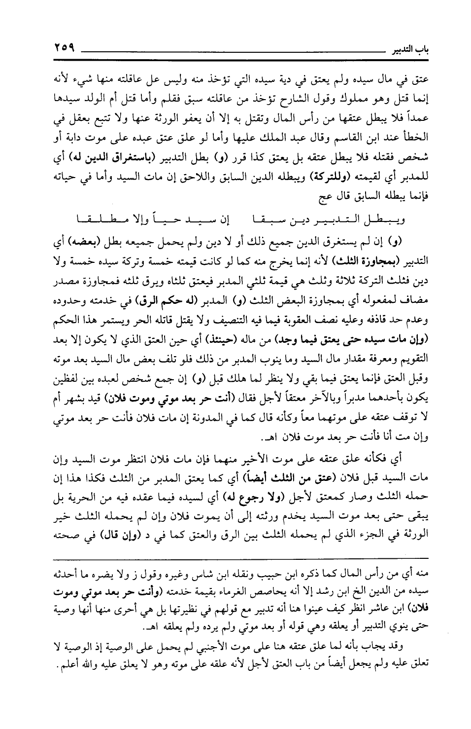 منه أي من رأس المال كما ذكره ابن حبيب ونقله ابن شاس وغيره وقول ز ولا يضره ما أحدثه سيده من الدين الخ ابن رشد إلا أنه يحاصص الغرماء بقيمة خدمته (وأنت حر بعد موتي وموت فلان) ابن عاشر انظر كيف عينوا هنا أنه تدبير مع قولهم في نظيرتها بل هي أحرى منها أنها وصية حتى ينوي التدبير أو يعلقه وهي قوله أو بعد موتي ولم يرده ولم يعلقه اهـ.