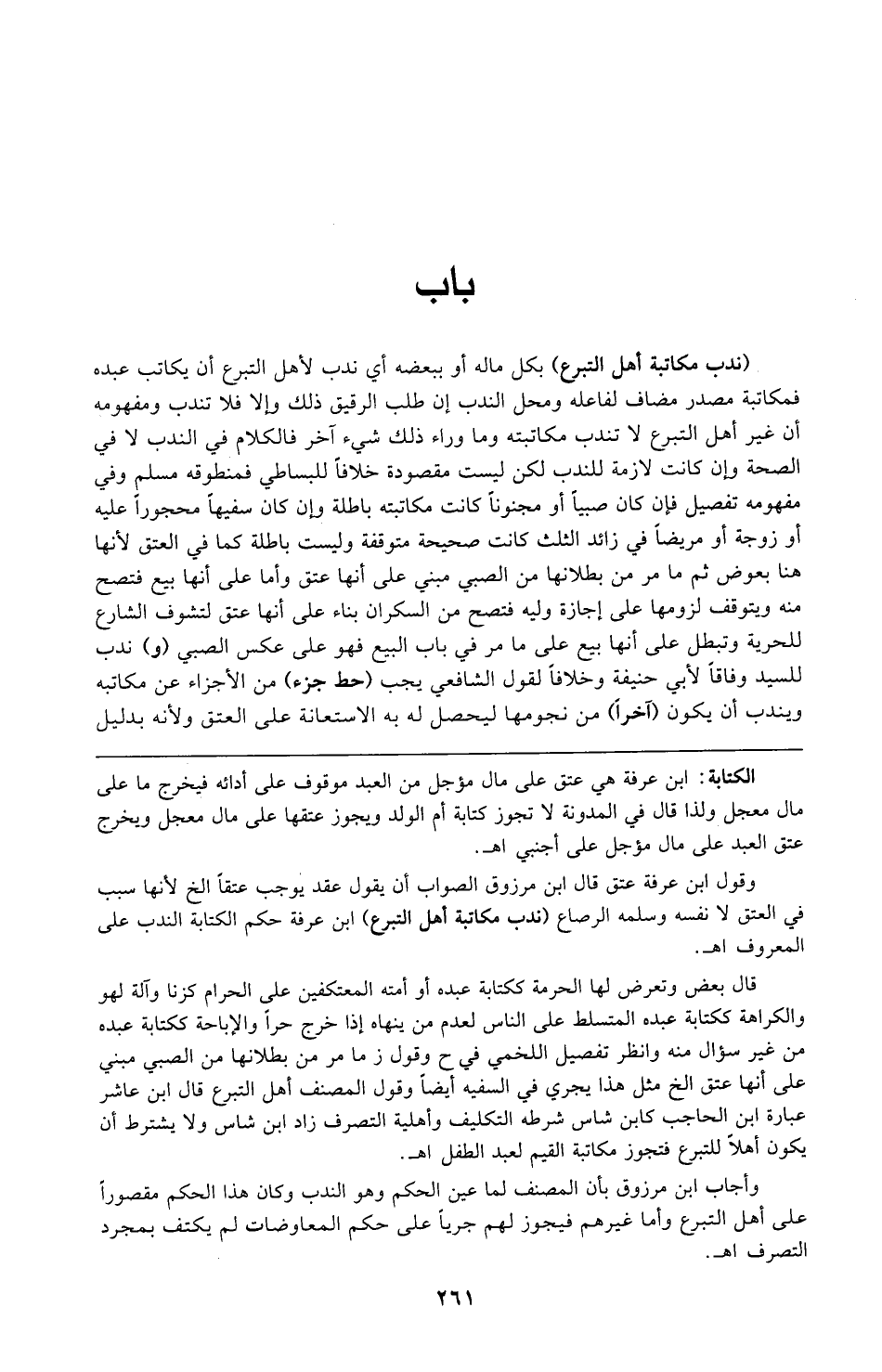 وقول ابن عرفة عتق قال ابن مرزوق الصواب أن يقول عقد يوجب عتقًا الخ لأنها سبب في العتق لا نفسه وسلمه الرصاع (ندب مكاتبة أهل التبرع) ابن عرفة حكم الكتابة الندب على المعروف اهـ.