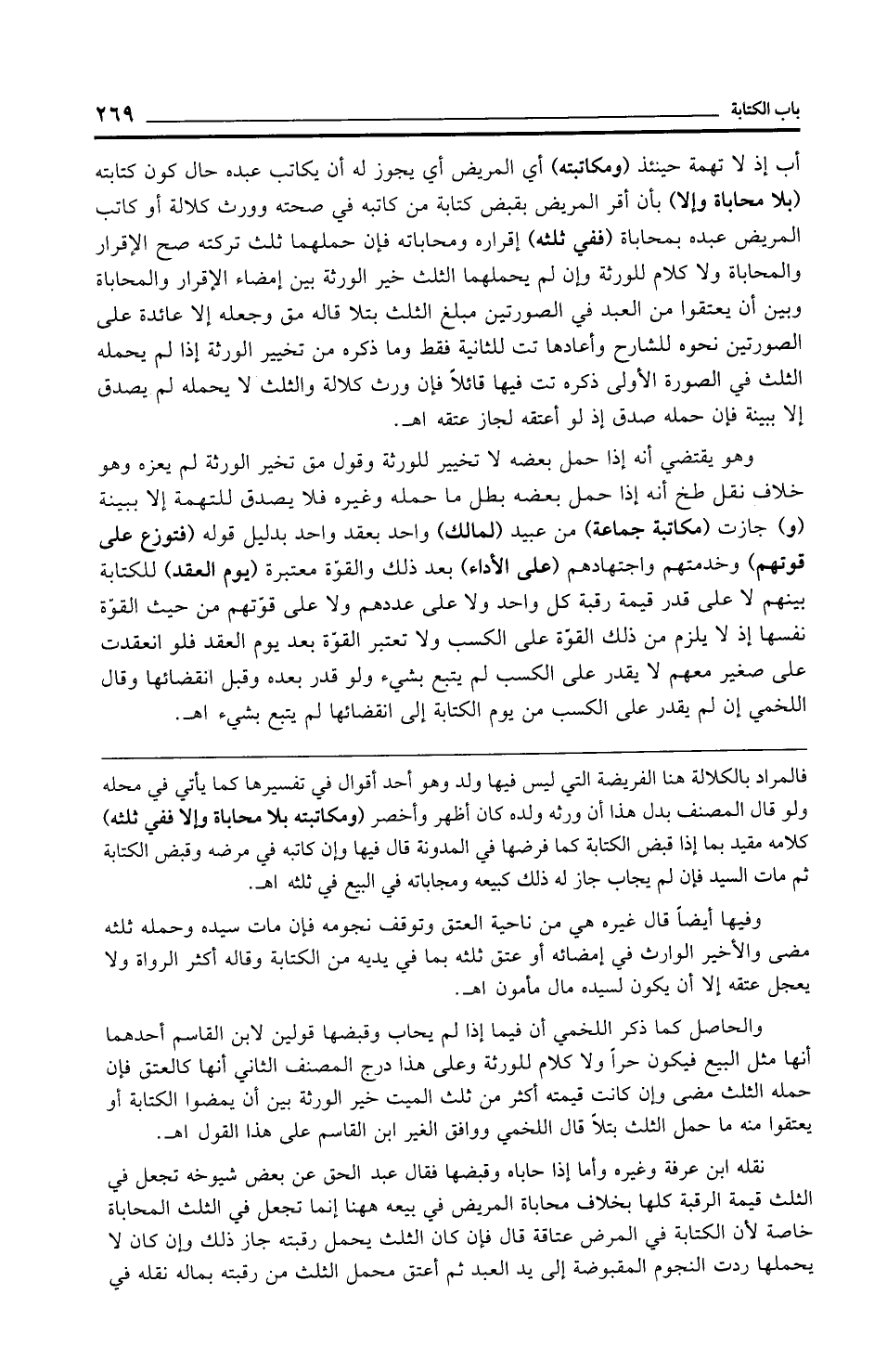 فالمراد بالكلالة هنا الفريضة التي ليس فيها ولد وهو أحد أقوال في تفسيرها كما يأتي في محله ولو قال المصنف بدل هذا أن ورثه ولده كان أظهر وأخصر (ومكاتبته بلا محاباة وإلا ففي ثلثه) كلامه مقيد بما إذا قبض الكتابة كما فرضها في المدونة قال فيها وإن كاتبه في مرضه وقبض الكتابة ثم مات السيد فإن لم يجاب جاز له ذلك كبيعه ومجاباته في البيع في ثلثه اهـ.