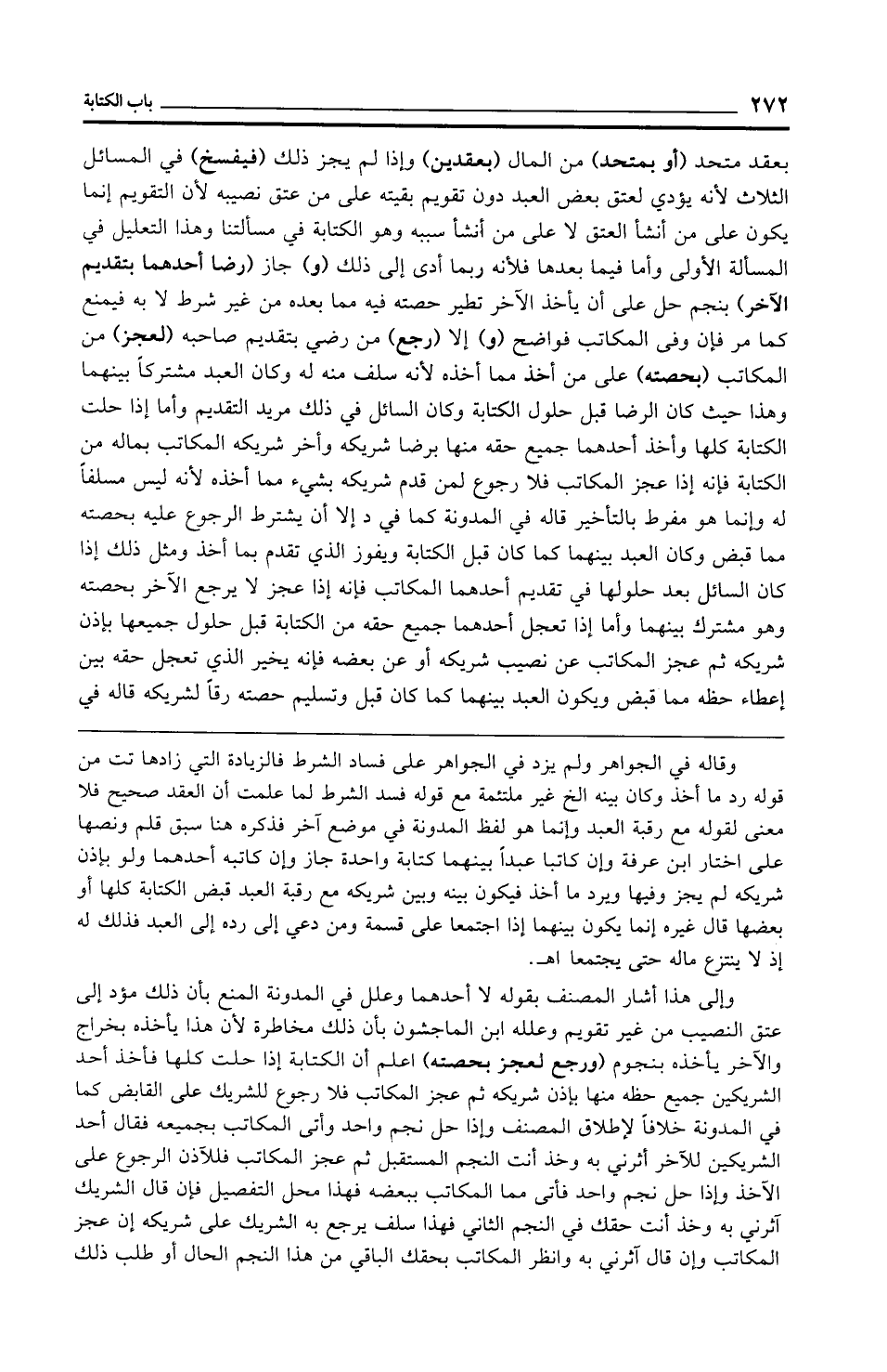 وإلى هذا أشار المصنف بقوله لا أحدهما وعلل في المدونة المنع بأن ذلك مؤد إلى عتق النصيب من غير تقويم وعلله ابن الماجشون بأن ذلك مخاطرة لأن هذا يأخذه بخراج والآخر يأخذه بنجوم (ورجع لعجز بحصته) اعلم أن الكتابة إذا حلت كلها فأخذ أحد الشريكين جميع حظه منها بإذن شريكه ثم عجز المكاتب فلا رجوع للشريك على القابض كما في المدونة خلافًا لإطلاق المصنف وإذا حل نجم واحد وأتى المكاتب بجميعه فقال أحد الشريكين للآخر أثرني به وخذ أنت النجم المستقبل ثم عجز المكاتب فللآذن الرجوع على الآخذ وإذا حل نجم واحد فأتى مما المكاتب ببعضه فهذا محل التفصيل فإن قال الشريك آثرني به وخذ أنت حقك في النجم الثاني فهذا سلف يرجع به الشريك على شريكه إن عجز المكاتب وإن قال آثرني به وانظر المكاتب بحقك الباقي من هذا النجم الحال أو طلب ذلك