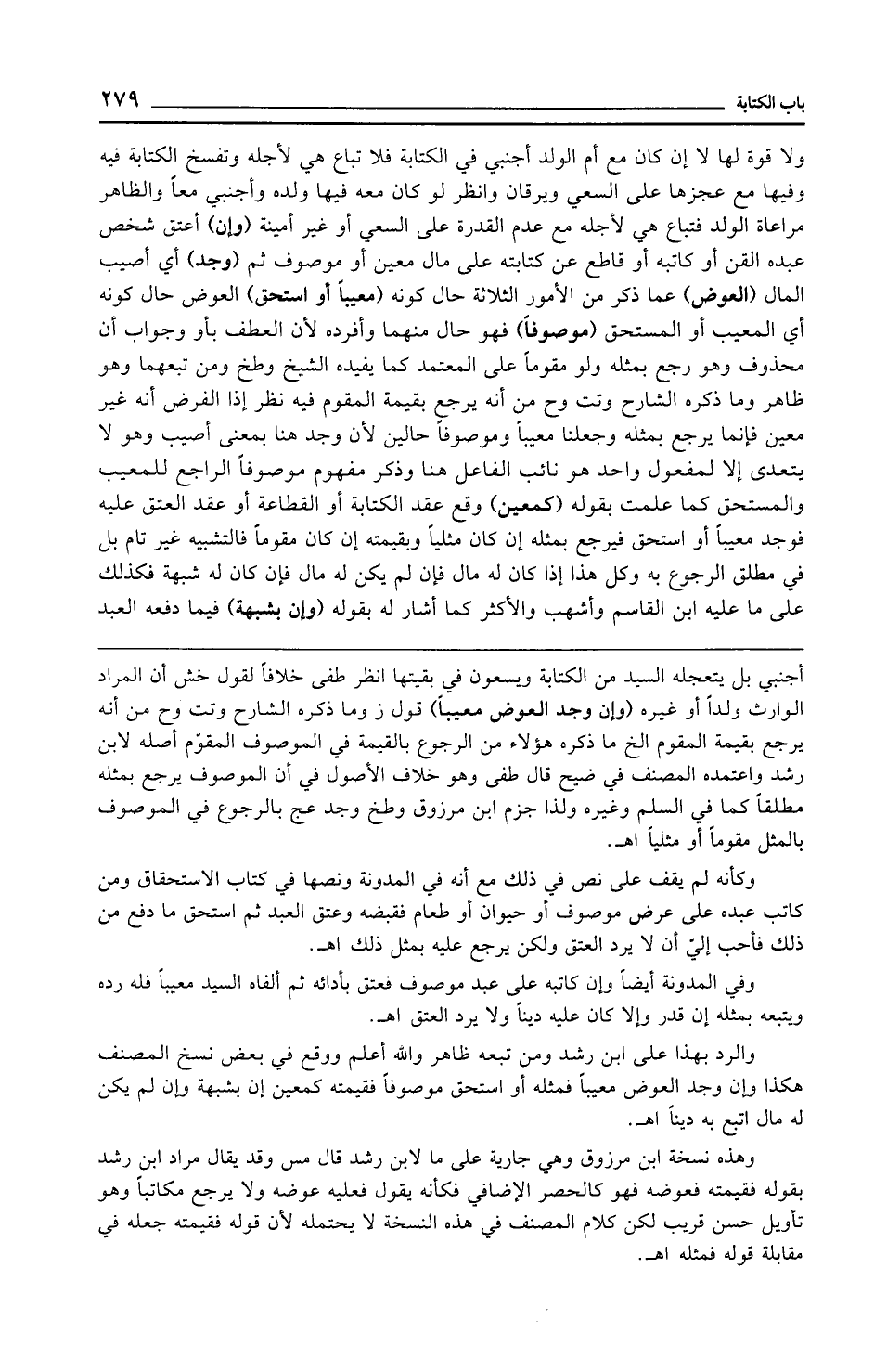 وهذه نسخة ابن مرزوق وهي جارية على ما لابن رشد قال مس وقد يقال مراد ابن رشد بقوله فقيمته فعوضه فهو كالحصر الإضافي فكأنه يقول فعليه عوضه ولا يرجع مكاتبًا وهو تأويل حسن قريب لكن كلام المصنف في هذه النسخة لا يحتمله لأن قوله فقيمته جعله في مقابلة قوله فمثله اهـ.