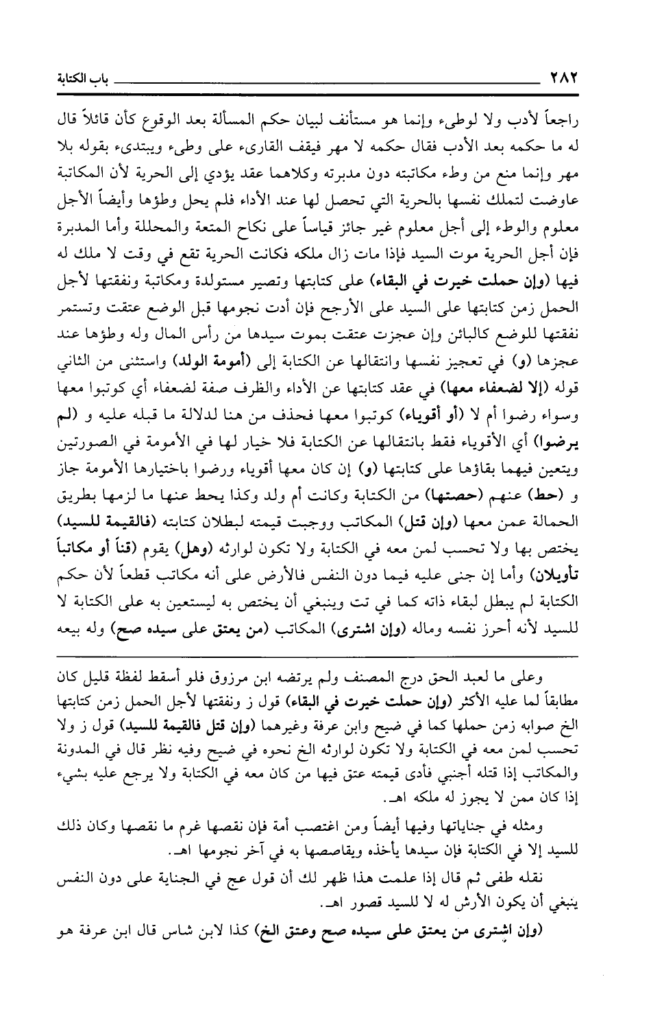 راجعًا لأدب ولا لوطىء وإنما هو مستأنف لبيان حكم المسألة بعد الوقوع كأن قائلًا قال له ما حكمه بعد الأدب فقال حكمه لا مهر فيقف القارئ على وطئ ويبتدىء بقوله بلا مهر وإنما منع من وطء مكاتبته دون مدبرته وكلاهما عقد يؤدي إلى الحرية لأن المكاتبة عاوضت لتملك نفسها بالحرية التي تحصل لها عند الأداء فلم يحل وطؤها وأيضًا الأجل معلوم والوطء إلى أجل معلوم غير جائز قياسًا على نكاح المتعة والمحللة وأما المدبرة فإن أجل الحرية موت السيد فإذا مات زال ملكه فكانت الحرية تقع في وقت لا ملك له فيها (وإن حملت خيرت في البقاء) على كتابتها وتصير مستولدة ومكاتبة ونفقتها لأجل الحمل زمن كتابتها على السيد على الأرجح فإن أدت نجومها قبل الوضع عتقت وتستمر نفقتها للوضع كالبائن وإن عجزت عتقت بموت سيدها من رأس المال وله وطؤها عند عجزها (و) في تعجيز نفسها وانتقالها عن الكتابة إلى (أمومة الولد) واستثنى من الثاني قوله (إلا لضعفاء معها) في عقد كتابتها عن الأداء والظرف صفة لضعفاء أي كوتبوا معها وسواء رضوا أم لا (أو أقوياء) كوتبوا معها فحذف من هنا لدلالة ما قبله عليه و (لم يرضوا) أي الأقوياء فقط بانتقالها عن الكتابة فلا خيار لها في الأمومة في الصورتين ويتعين فيهما بقاؤها على كتابتها (و) إن كان معها أقوياء ورضوا باختيارها الأمومة جاز و (حط) عنهم (حصتها) من الكتابة وكانت أم ولد وكذا يحط عنها ما لزمها بطريق الحمالة عمن معها (وإن قتل) المكاتب ووجبت قيمته لبطلان كتابته (فالقيمة للسيد) يختص بها ولا تحسب لمن معه في الكتابة ولا تكون لوارثه (وهل) يقوم (قنًّا أو مكاتبًا تأويلان) وأما إن جنى عليه فيما دون النفس فالأرض على أنه مكاتب قطعًا لأن حكم الكتابة لم يبطل لبقاء ذاته كما في تت وينبغي أن يختص به ليستعين به على الكتابة لا للسيد لأنه أحرز نفسه وماله (وإن اشترى) المكاتب (من يعتق على سيده صح) وله بيعه