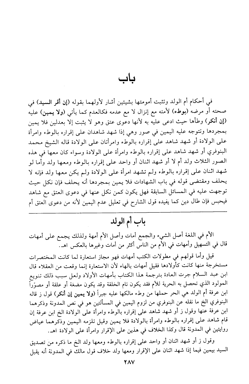 قيل وأما قولهم في مطولات الكتب أمهات فهو مجاز استعارة لما كانت المختصرات مستخرجة منها كانت كأولادها فقيل أمهات بالهاء لأن الاستعارة إنما وقعت من العقلاء قال ابن عبد السلام جرت العادة بترجمة هذا الكتاب بأمهات الأولاد ولعل سبب ذلك تنويع المولود الذي تحصل به الحرية للأم فقد يكون تام الخلقة وقد يكون مضغة أو علقة أو مصورًا ابن عرفة أم الولد هي الحر حملها من وطء مالكها عليه جبرًا (ولا يمين إن أنكر) قول ز قاله البنوفري الخ ما نقله عن البنوفري من لزوم اليمين في المسألتين هو في نص المدونة وذكرهما ابن عرفة عنها وقول ز أو شهد شاهد على إقراره بالوطء وامرأة على الولادة الخ ابن عرفة إن قام شاهد على إقراره بالوطء وامرأة بالولادة فلا يمين وقيل تلزمه اليمين وذكرهما عياض روايتين في المدونة قال وكذا الخلاف في هذين على الإقرار وامرأة على الولادة اهـ.