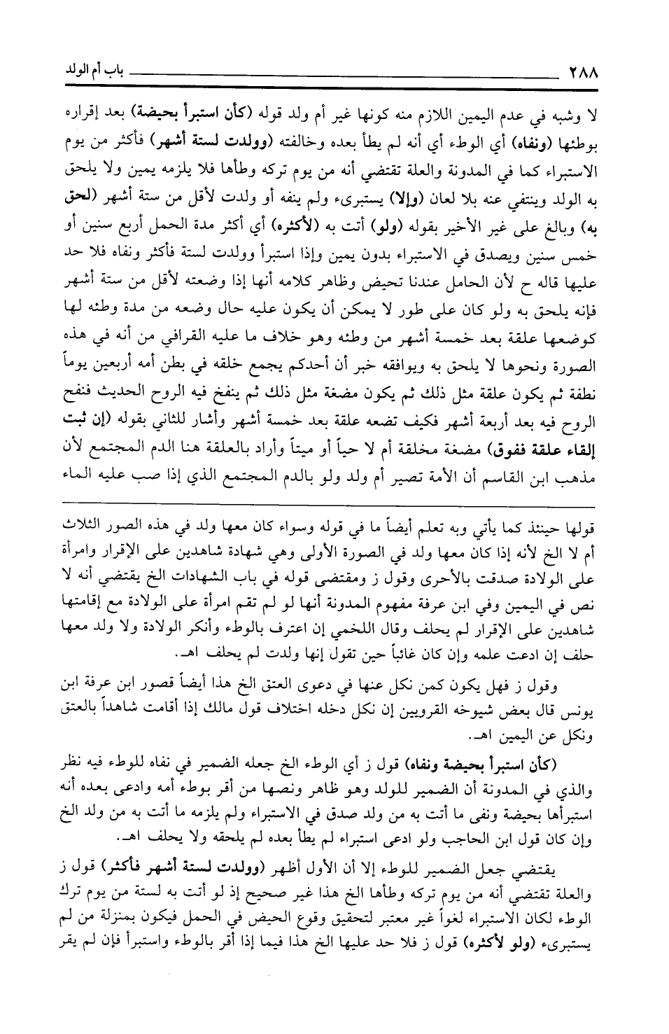 لا وشبه في عدم اليمين اللازم منه كونها غير أم ولد قوله (كأن استبرأ بحيضة) بعد إقراره بوطئها (ونفاه) أي الوطء أي أنه لم يطأ بعده وخالفته (وولدت لستة أشهر) فأكثر من يوم الاستبراء كما في المدونة والعلة تقتضي أنه من يوم تركه وطأها فلا يلزمه يمين ولا يلحق به الولد وينتفي عنه بلا لعان (وإلا) يستبرىء ولم ينفه أو ولدت لأقل من ستة أشهر (لحق به) وبالغ على غير الأخير بقوله (ولو) أتت به (لأكثره) أي أكثر مدة الحمل أربع سنين أو خمس سنين ويصدق في الاستبراء بدون يمين وإذا استبرأ وولدت لستة فأكثر ونفاه فلا حد عليها قاله ح لأن الحامل عندنا تحيض وظاهر كلامه أنها إذا وضعته لأقل من ستة أشهر فإنه يلحق به ولو كان على طور لا يمكن أن يكون عليه حال وضعه من مدة وطئه لها كوضعها علقة بعد خمسة أشهر من وطئه وهو خلاف ما عليه القرافي من أنه في هذه الصورة ونحوها لا يلحق به ويوافقه خبر أن أحدكم يجمع خلقه في بطن أمه أربعين يومًا نطفة ثم يكون علقة مثل ذلك ثم يكون مضغة مثل ذلك ثم ينفخ فيه الروح الحديث فنفح الروح فيه بعد أربعة أشهر فكيف تضعه علقة بعد خمسة أشهر وأشار للثاني بقوله (إن ثبت إلقاء علقة ففوق) مضغة مخلقة أم لا حيًّا أو ميتًا وأراد بالعلقة هنا الدم المجتمع لأن مذهب ابن القاسم أن الأمة تفسير أم ولد ولو بالدم المجتمع الذي إذا صب عليه الماء