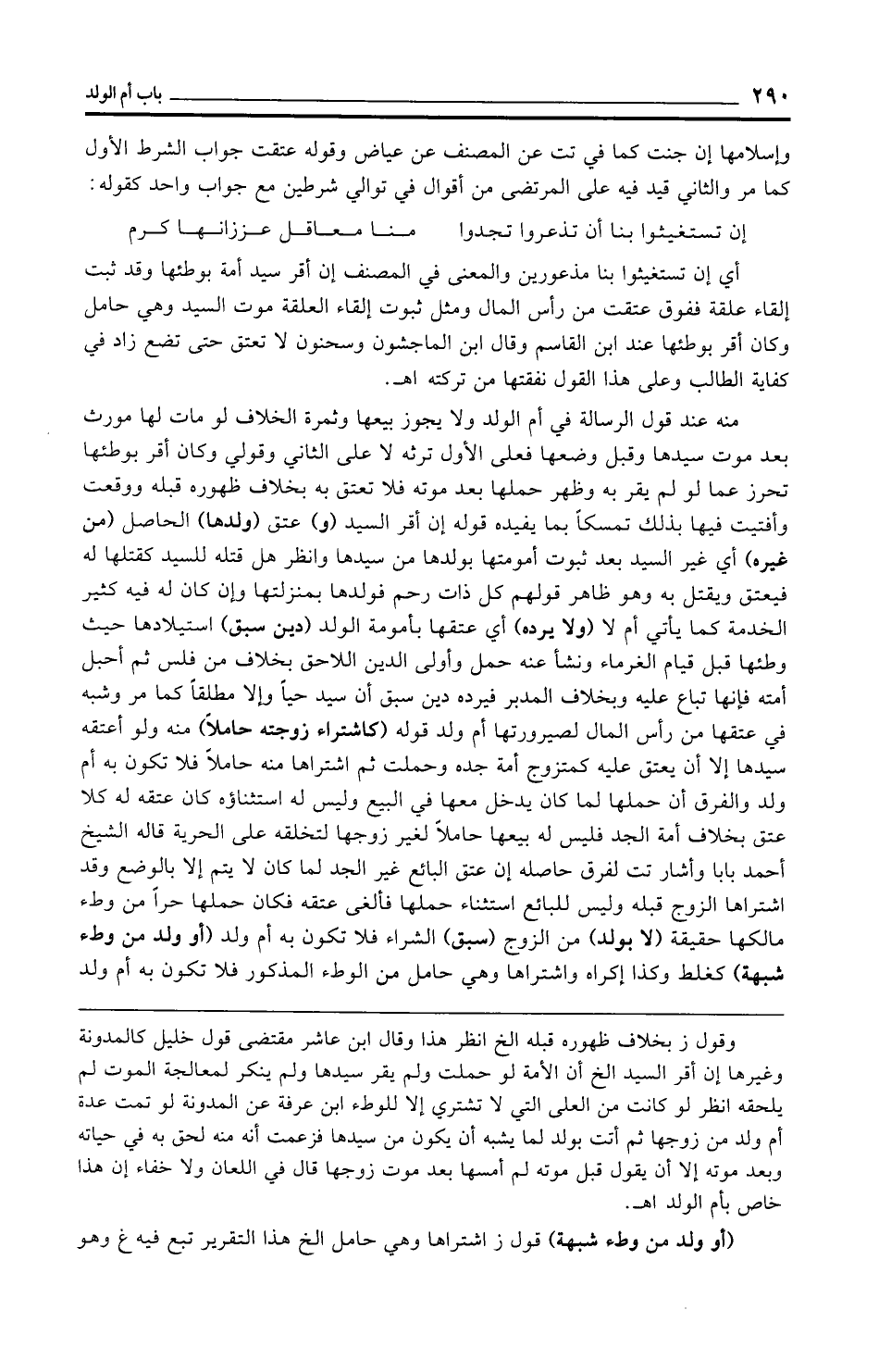 منه عند قول الرسالة في أم الولد ولا يجوز بيعها وثمرة الخلاف لو مات لها مورث بعد موت سيدها وقبل وضعها فعلى الأول ترثه لا على الثاني وقولي وكان أقر بوطئها تحرز عما لو لم يقر به وظهر حملها بعد موته فلا تعتق به بخلاف ظهوره قبله ووقعت وأفتيت فيها بذلك تمسكًا بما يفيده قوله إن أقر السيد (و) عتق (ولدها) الحاصل (من غيره) أي غير السيد بعد ثبوت أمومتها بولدها من سيدها وانظر هل قتله للسيد كقتلها له فيعتق ويقتل به وهو ظاهر قولهم كل ذات رحم فولدها بمنزلتها وإن كان له فيه كثير الخدمة كما يأتي أم لا (ولا يرده) أي عتقها بأمومة الولد (دين سبق) استيلادها حيث وطئها قبل قيام الغرماء ونشأ عنه حمل وأولى الدين اللاحق بخلاف من فلس ثم أحبل أمته فإنها تباع عليه وبخلاف المدبر فيرده دين سبق أن سيد حيًّا وإلا مطلقًا كما مر وشبه في عتقها من رأس المال لصيرورتها أم ولد قوله (كاشتراء زوجته حاملًا) منه ولو أعتقه سيدها إلا أن يعتق عليه كمتزوج أمة جده وحملت ثم اشتراها منه حاملًا فلا تكون به أم ولد والفرق أن حملها لما كان يدخل معها في البيع وليس له استثناؤه كان عتقه له كلا عتق بخلاف أمة الجد فليس له بيعها حاملًا لغير زوجها لتخلقه على الحرية قاله الشيخ أحمد بابا وأشار تت لفرق حاصله إن عتق البائع غير الجد لما كان لا يتم إلا بالوضع وقد اشتراها الزوج قبله وليس للبائع استثناء حملها فألغى عتقه فكان حملها حرًّا من وطء مالكها حقيقة (لا بولد) من الزوج (سبق) الشراء فلا تكون به أم ولد (أو ولد من وطء شبهة) كغلط وكذا إكراه واشتراها وهي حامل من الوطء المذكور فلا تكون به أم ولد