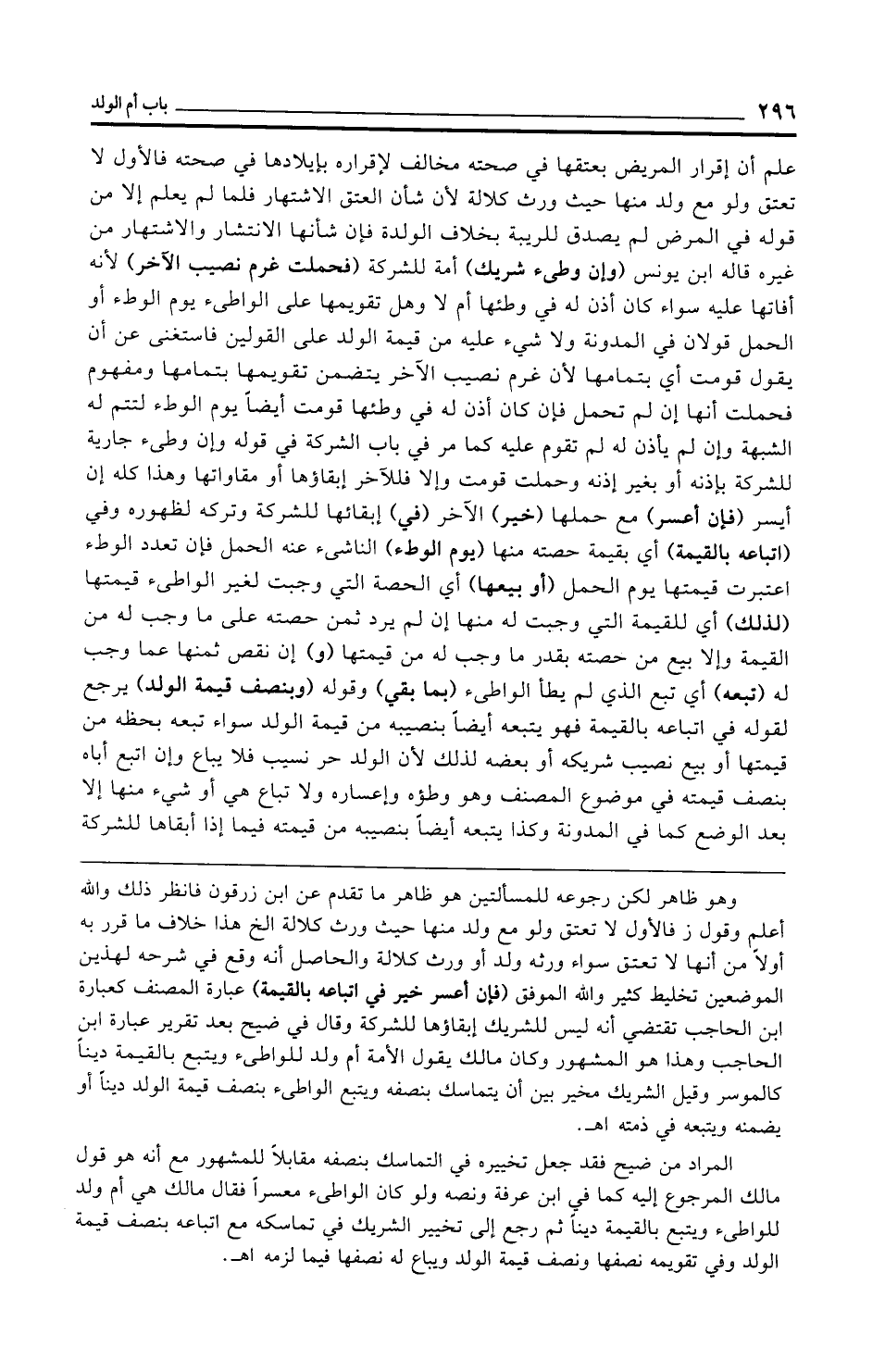 المراد من ضيح فقد جعل تخييره في التماسك بنصفه مقابلًا للمشهور مع أنه هو قول مالك المرجوع إليه كما في ابن عرفة ونصه ولو كان الواطىء معسرًا فقال مالك هي أم ولد للواطىء ويتبع بالقيمة دينًا ثم رجع إلى تخيير الشريك في تماسكه مع اتباعه بنصف قيمة الولد وفي تقويمه نصفها ونصف قيمة الولد ويباع له نصفها فيما لزمه اهـ.